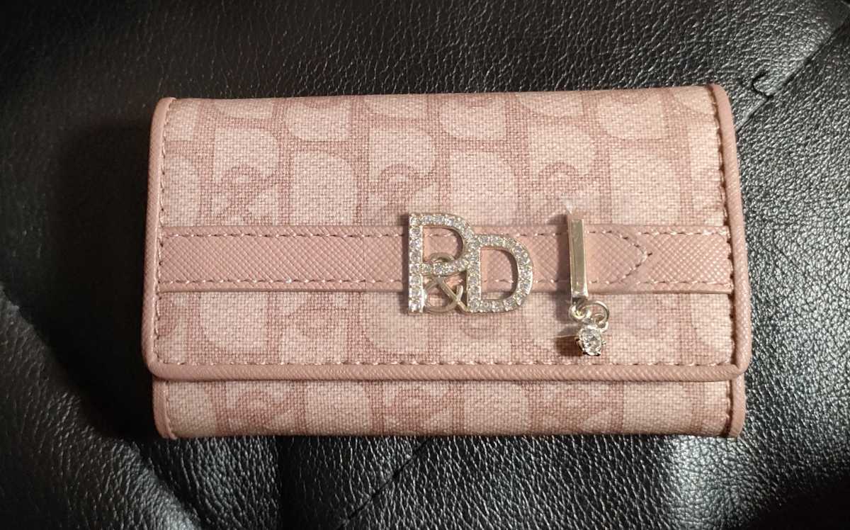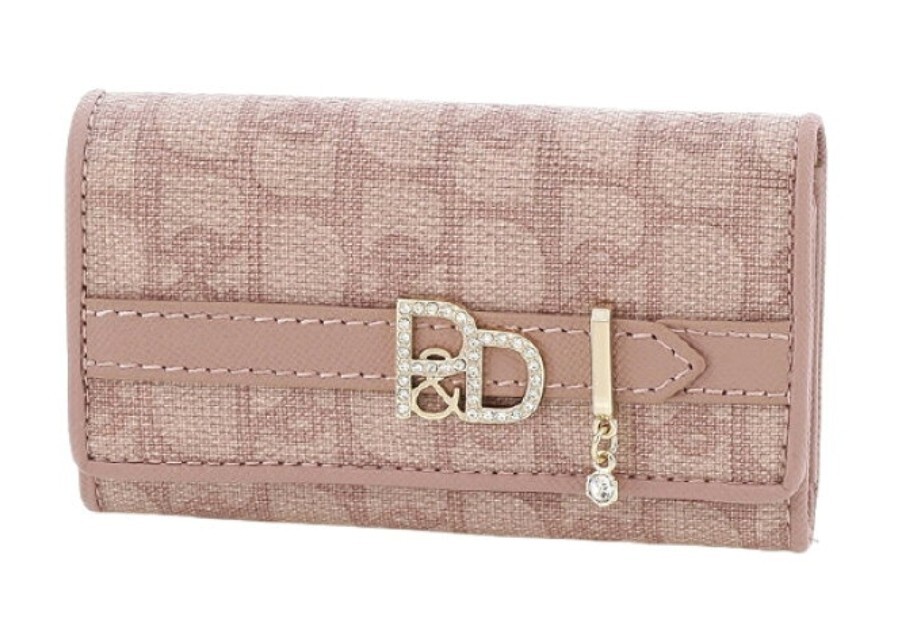 P&Dオリジナル柄のプリント素材にベルト使いのデザインで引き締めた、揺れるクリスタルが目を引くピンキーのベーシックなお財布・小物シリーズ。