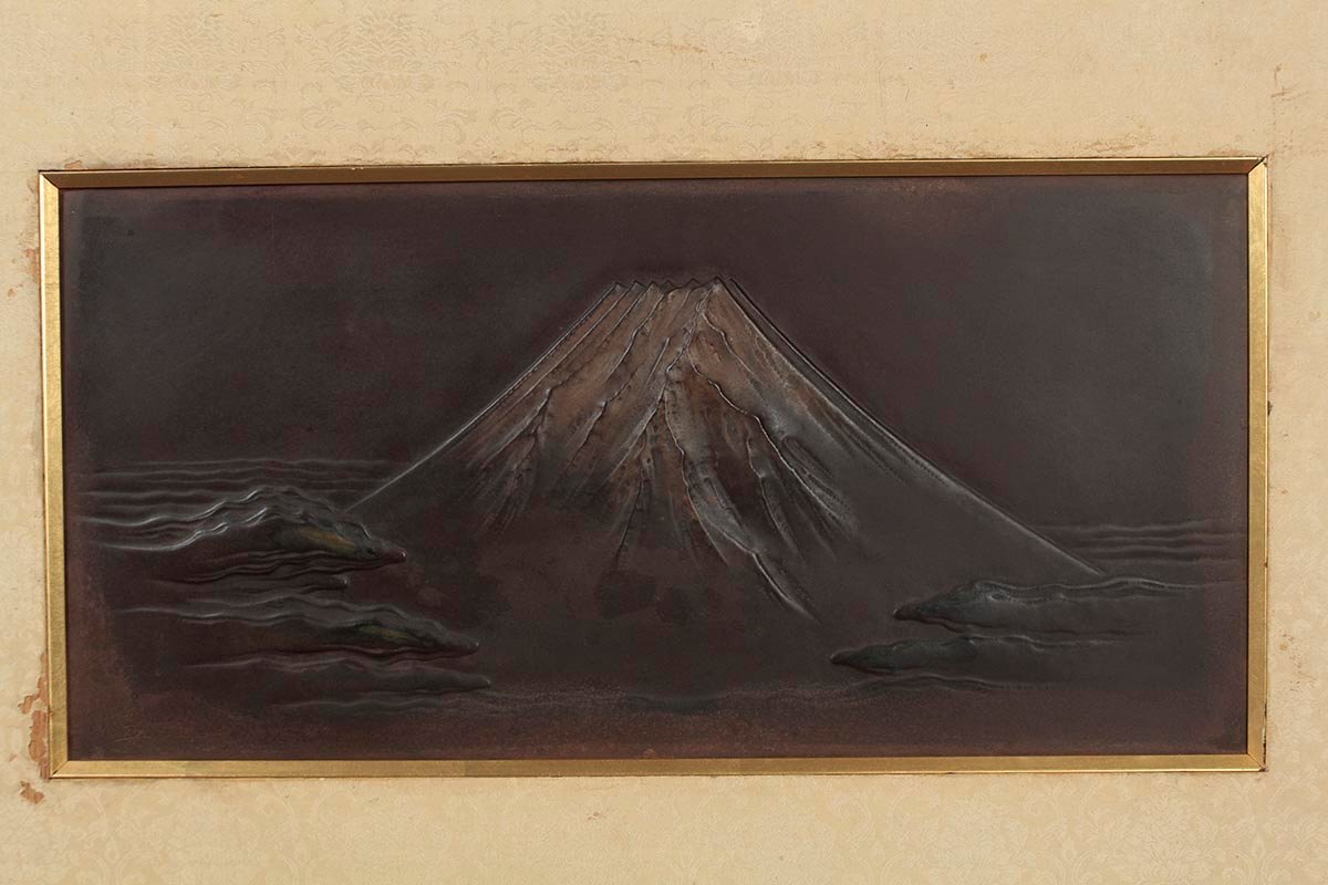 | ◆ 時代金工【太田春景 造(戴陽斎)】鉄打出「富士雲海図」扁額 彫金額 横83.2cm 総重4.2kg 壁掛け 古美術 ◆