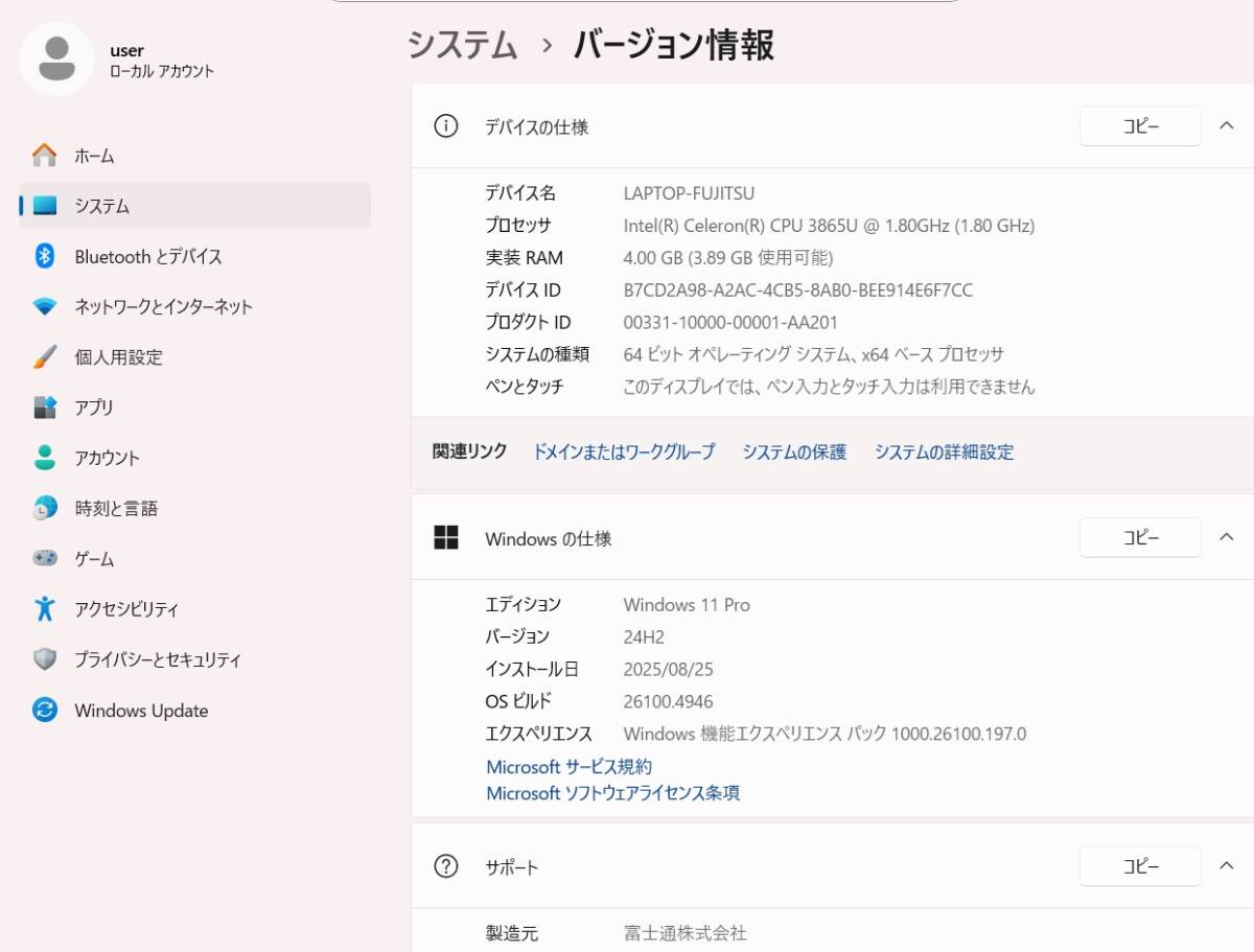 | ★商品説明★ | FUJITSU FUTRO MU937を出品致します。 CPU:Intel Celeron-3865U 記録ストレージ: SSD128GB メモリ:4GB 光学ドライブ:非搭載 画面サイズ:13.3型 OS:Windows11 Pro 64bit 24H2 webカメラ:非搭載 無線LAN:搭載 Bluetooth:搭載 中古品のため少しの小傷、擦り傷は御座いますが 大きなダメージは無く主観ですが美品の部類かと思います。 バッテリーでの使用も可能ですが消耗品につき稼働時間は未計測です。 補足説明となりますが当機種は裏蓋のネジを外せば ストレージの交換(M.2 SSD) メモリの増設(DDR4) バッテリーの交換 等が簡単に行えます。 OpenOffice.org 3.3 インストール済み!! FUTRO MU937の詳細な仕様については下記URLを参照ください。 https://jp.fujitsu.com/platform/pc/product/futro/1804/mu937/spec.html メーカーキャッチコピー 快適なモバイル活用を可能にする超軽量コンパクト筺体 質量約799g、薄さ約15.5mmとモビリティーを追求した13.3型の超軽量端末。 付属品 ACアダプター 宜しくお願い致します。 |