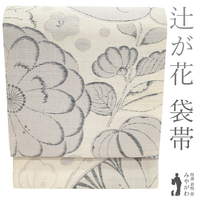 袋帯 未使用 正絹 京都 西陣 金通し 薄ベージュ ライトグレー 辻が花 葵 上質な織り カジュアル 新古品 仕立て上がり みやがわ sb54339