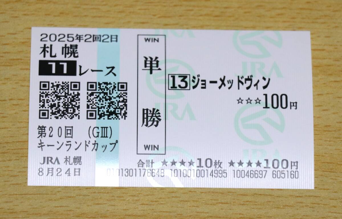ジョーメッドヴィン 札幌 11R キーンランドカップ (2025年8/24) 現地単勝馬券(札幌競馬場)です。気に入って頂けた方の落札を心よりお待ちしております。 商品は定型郵便(110円)又は又はゆうパケットポストminiで発送となります。 厚さの関係上、定型郵便の場合は片面段ボール補強、ゆうパケットポストの場合は両面段ボール補強となります。どうかよろしくお願い致します。