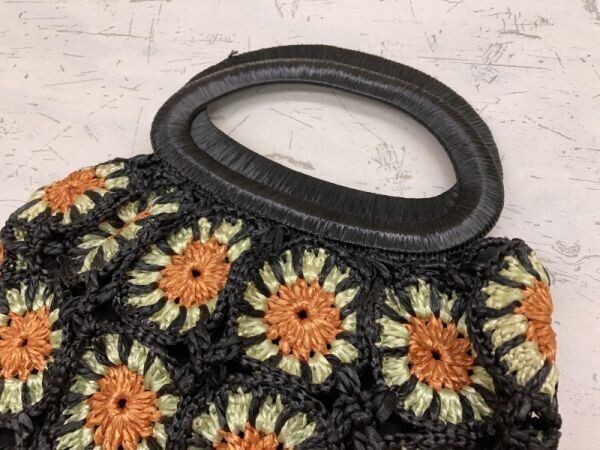 オールド レトロ モード 花柄 ひまわり柄 グラニースクエア 編み 刺繍 ナイロン系糸使用 手提げ ハンドバッグ ハンドルバッグ カバン 黒