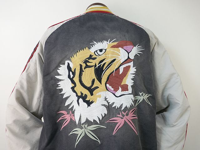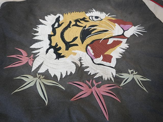 身頃生地にインディゴナイロンを使用し、その上から虎柄の刺繍を施しています。