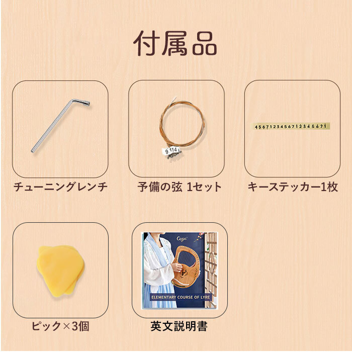 商品説明 | ・・【初心者やお子様にもオススメ♪】 ・オルゴールのような優しい音色が魅力の「ライアー ハープ 16弦 19弦」が登場。 ・【気軽に演奏できる♪ライアーハープ】 ・オルゴールのような優しい音色だから、気軽に演奏できる!コンパクトサイズなのもGOOD。 ・【楽譜が読めなくても大丈夫】 ・英字マニュアルとキーステッカーつき。キーを見ながら弾けるので、初心者の方にもオススメ。 ・【ぬくもりを感じる木製仕様】 ・癒しの音色を奏でる、木製仕様。ぬくもりを感じ、インテリア性もあるウッドテイストが魅力。 ・【セットアイテムですぐにスタート!】 ・ピックと調律棒、予備用弦、キーステッカーがセットに!備品いらずですぐに始められる◎ ・【お子様や高齢の方にもオススメ】 ・コンパクトで軽く、扱いやすいので誰でも演奏しやすい☆持ち運びができるのもポイント。 |