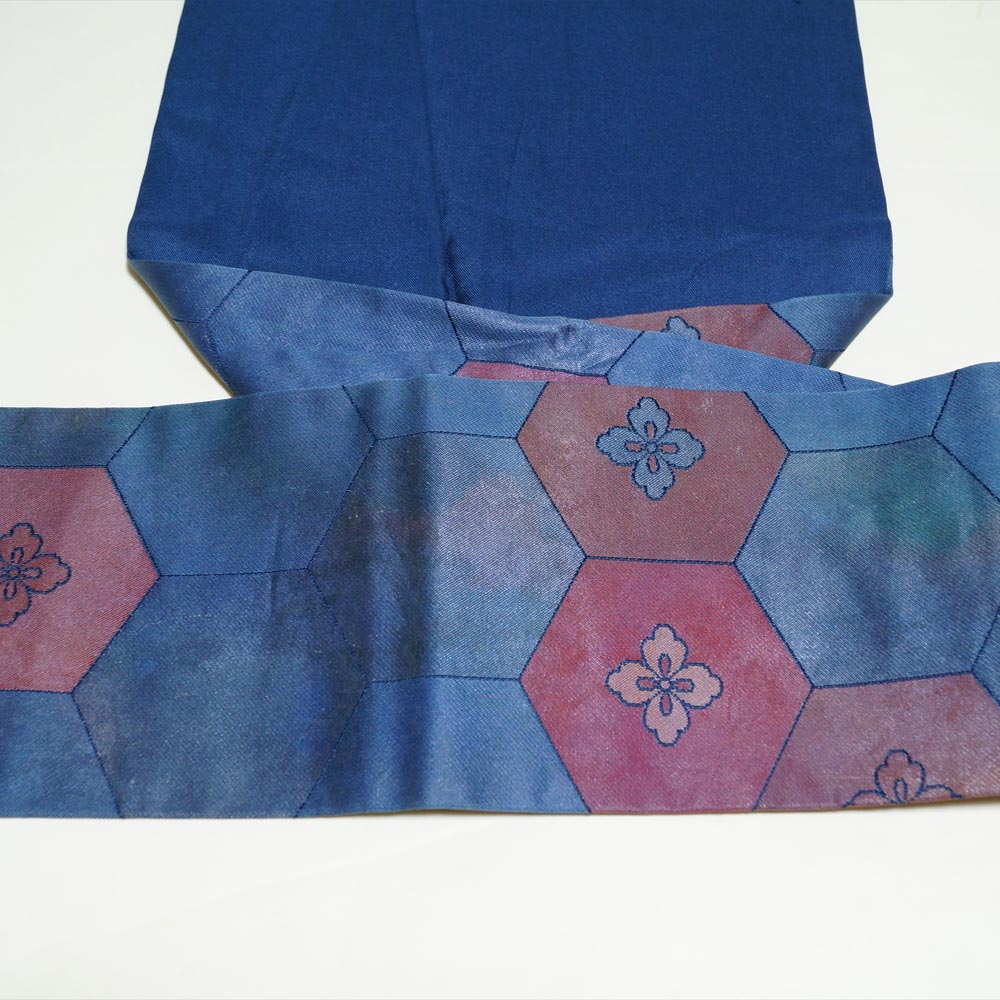 商品 説明 | 菖蒲色系の総絞り地に、お花模様が絞り染めされた小紋と、紺色系の地に亀甲に花菱模様が織られた名古屋帯の2点セットです。 |