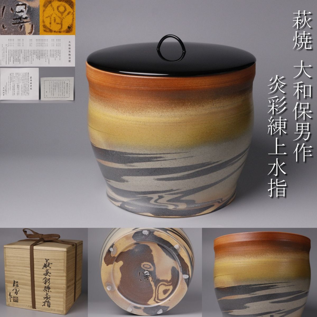 大和 保男(やまと やすお) 日本の陶芸家、萩焼作家。山口県指定無形文化財萩焼保持者。 小学生の頃、第二次世界大戦の影響で陶工が召集されたことにより、 大和が代わりに窯の手伝いを始めることになる。 中学生になると、父の指導により本格的な陶工に成長した。 1933年 山口県山口市出身 1980年より、日本工芸会山口支部幹事長に就任。 1988年 山口県指定無形文化財に指定された。 2000年 フランスで「萩焼400年パリ展」を開催するなど海外にも活動の幅を広げる。