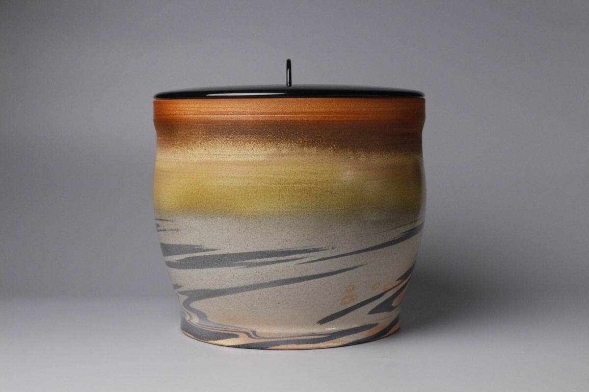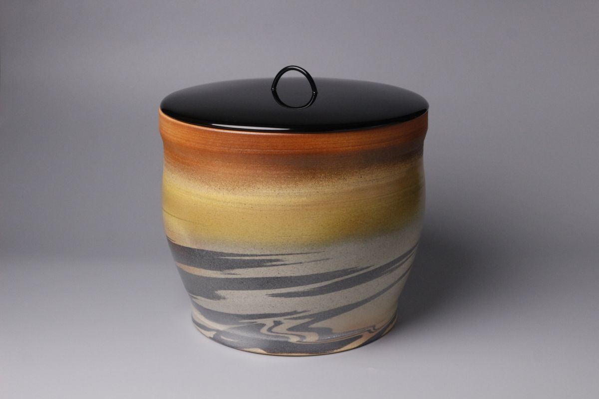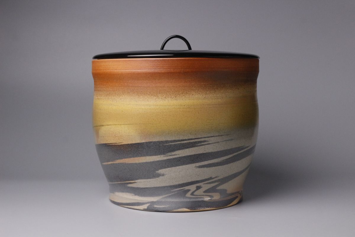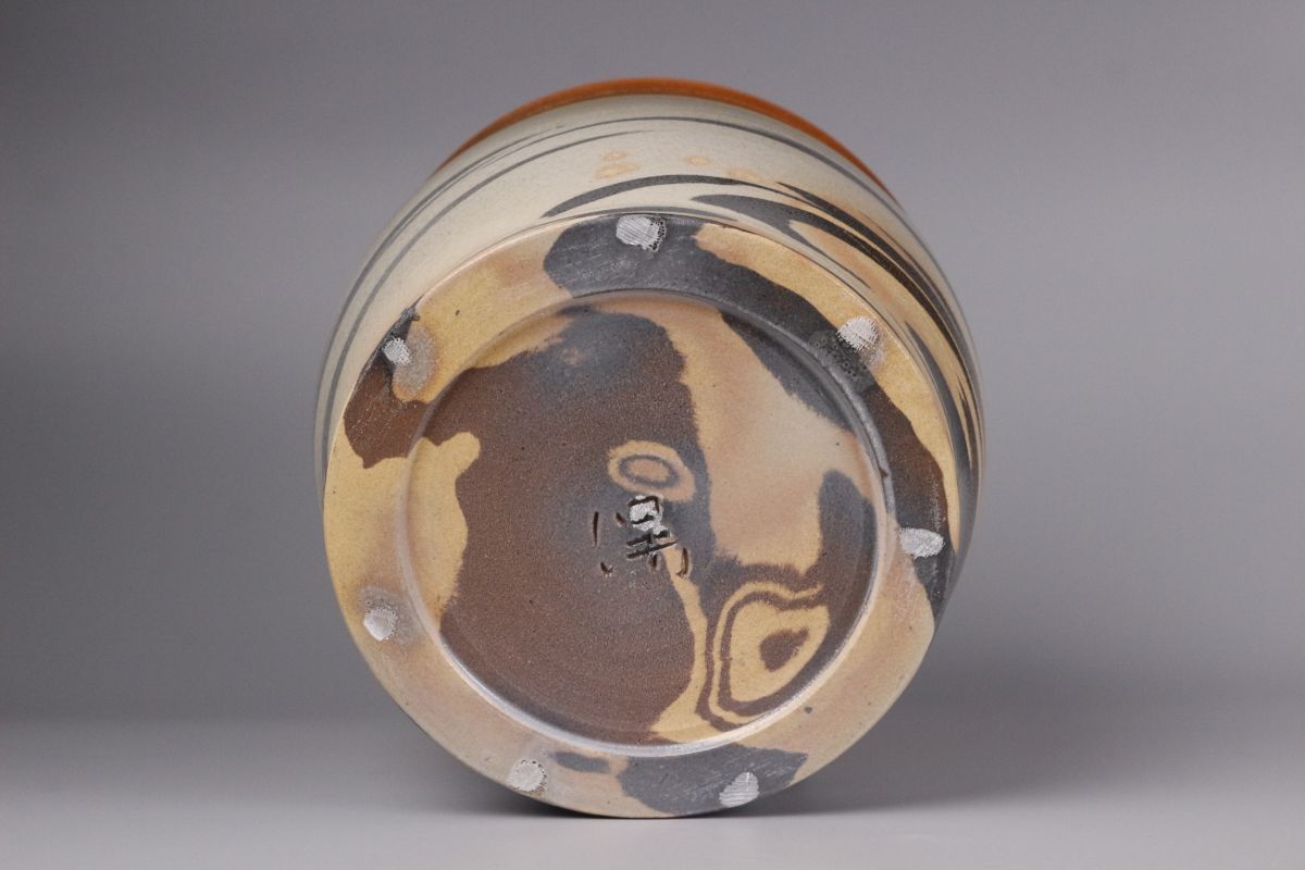 虹色のまだら模様が特徴的かつ魅力的で、 絶妙な色の変化は趣深く 独特な赤茶色の肌地は何とも言えない深い味わいが感じられます。 萩焼の素朴な肌地もしっかりと感じられる温かみのある作品となっております。 萩焼の伝統を守りながらも独創的な作品を生み出し続ける匠の逸品を、 この機会に是非お手元にてご堪能下さい。