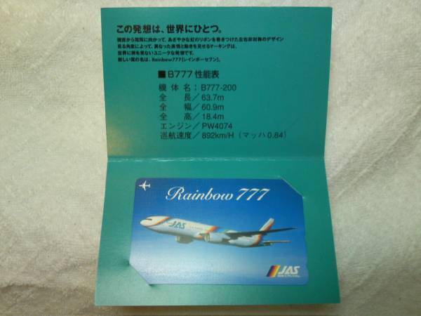 JAS ジャパンエアーシステム (未使用・新品) レインボーRainbow B777 レインボー・スリーブ付きテレカ。