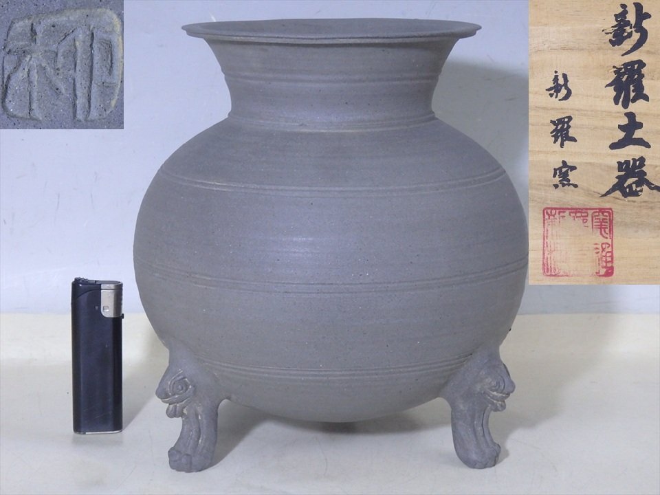 日本铁壶 - ★セール!三ッ足【新羅土器 木箱入り】ワレカケなし! 胴径20cm 高さ21.8cm 口径9cm 壷 朝鮮 レプリカ 韓国