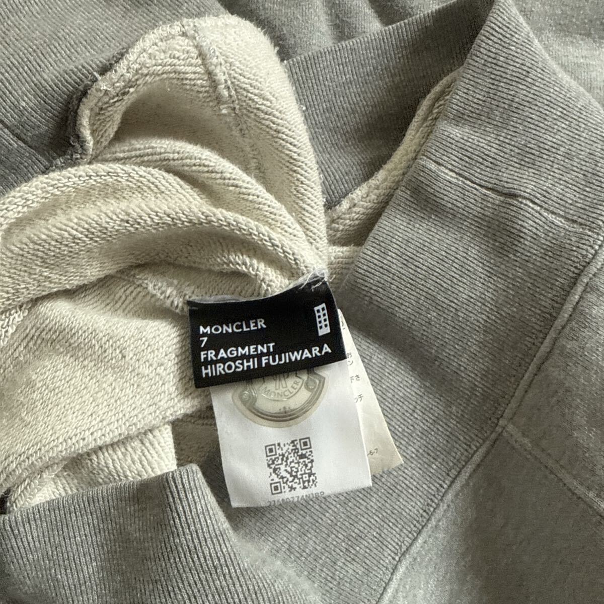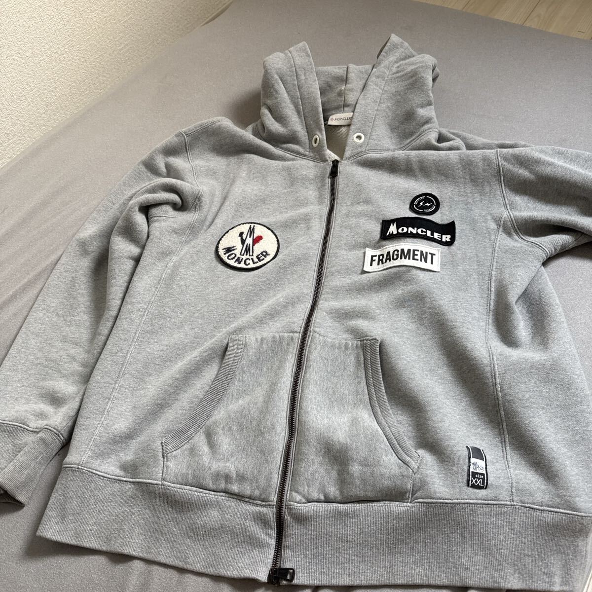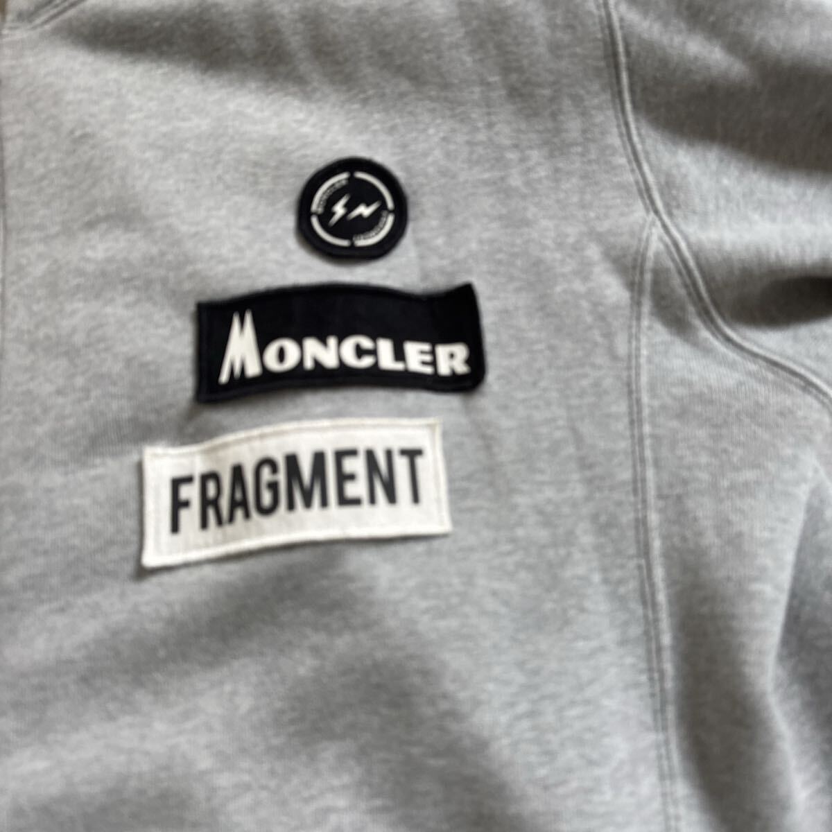 フード付きのグレーのパーカー、MonclerとFragmentのパッチ付き。