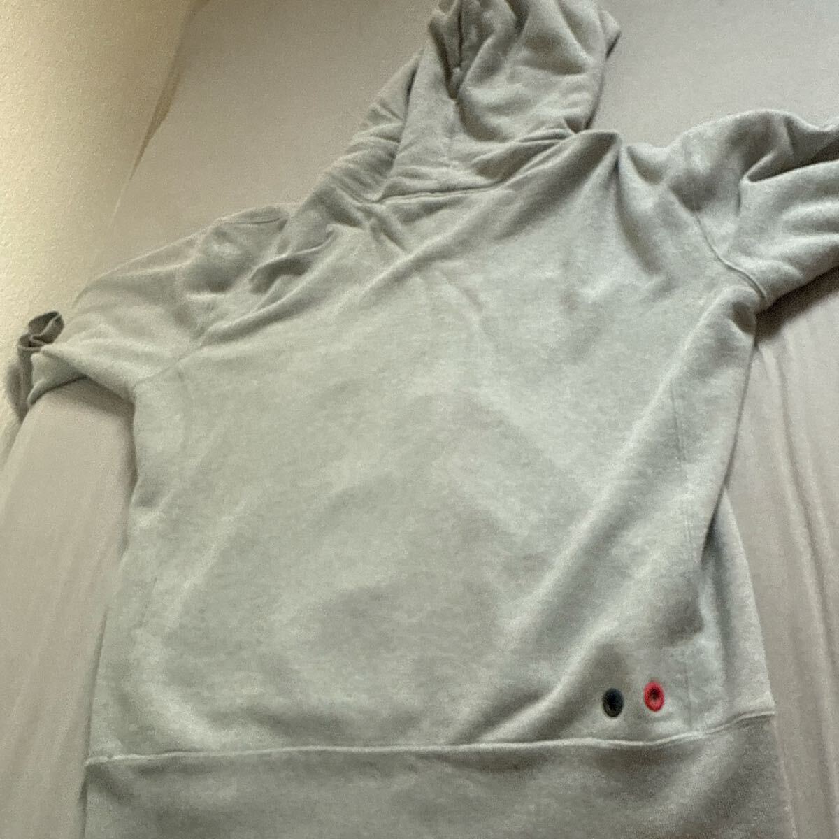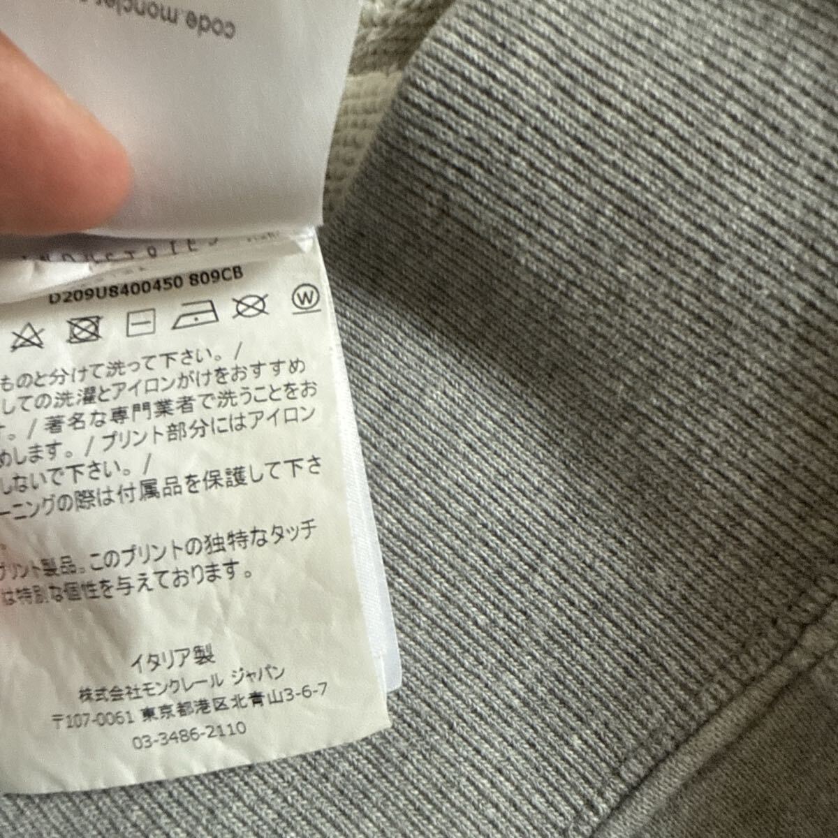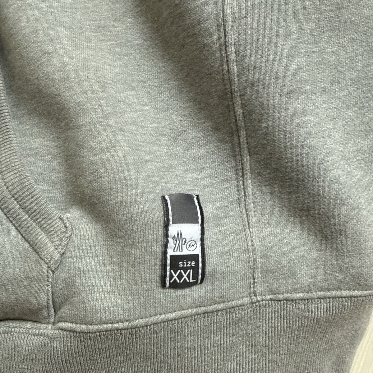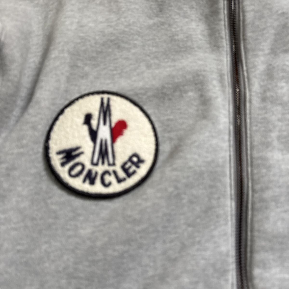フード付きのグレーのパーカー、MonclerとFragmentのパッチ付き。