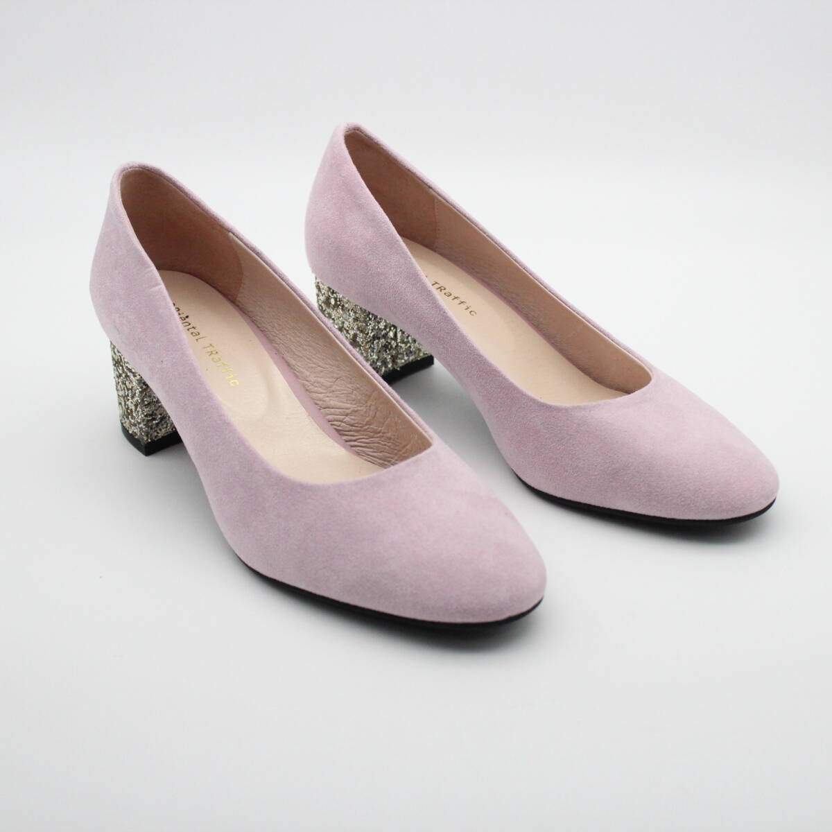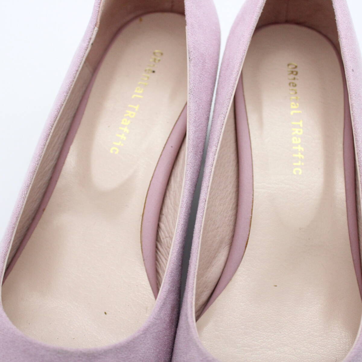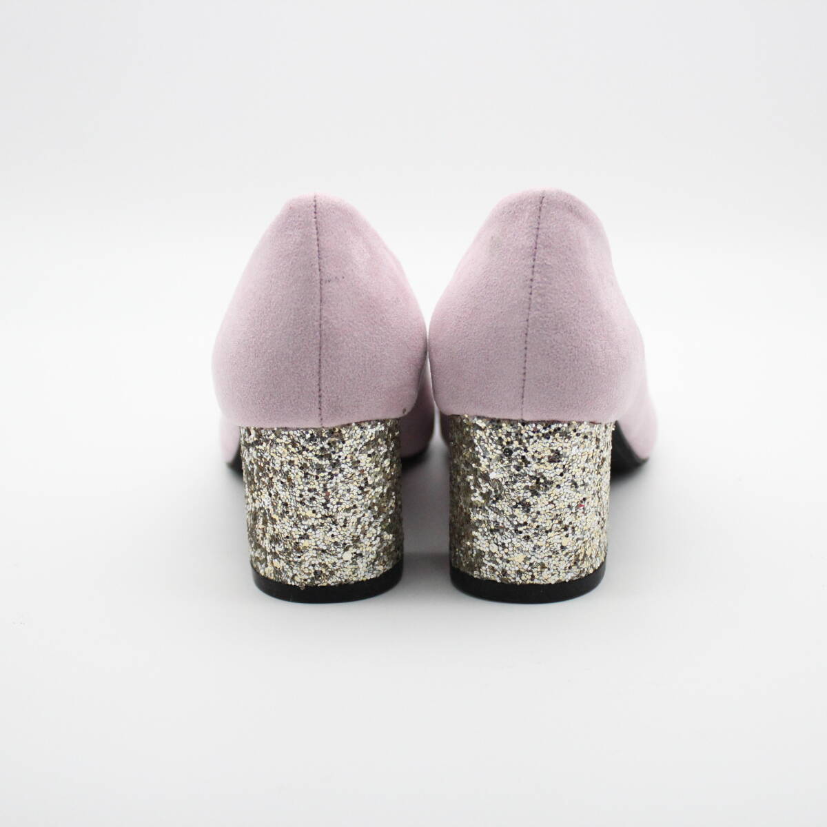 煌びやかなグリッターヒールが目を惹くパンプスはシンプルなデザインに仕上げて取り入れやすいアイテムに。ほんのりスクエアトゥがきちんと感を演出しつつ、チャンキーヒールでカジュアル要素も持ち合わせている優れもの。トレンドのラベンダーカラーは注目の1足。