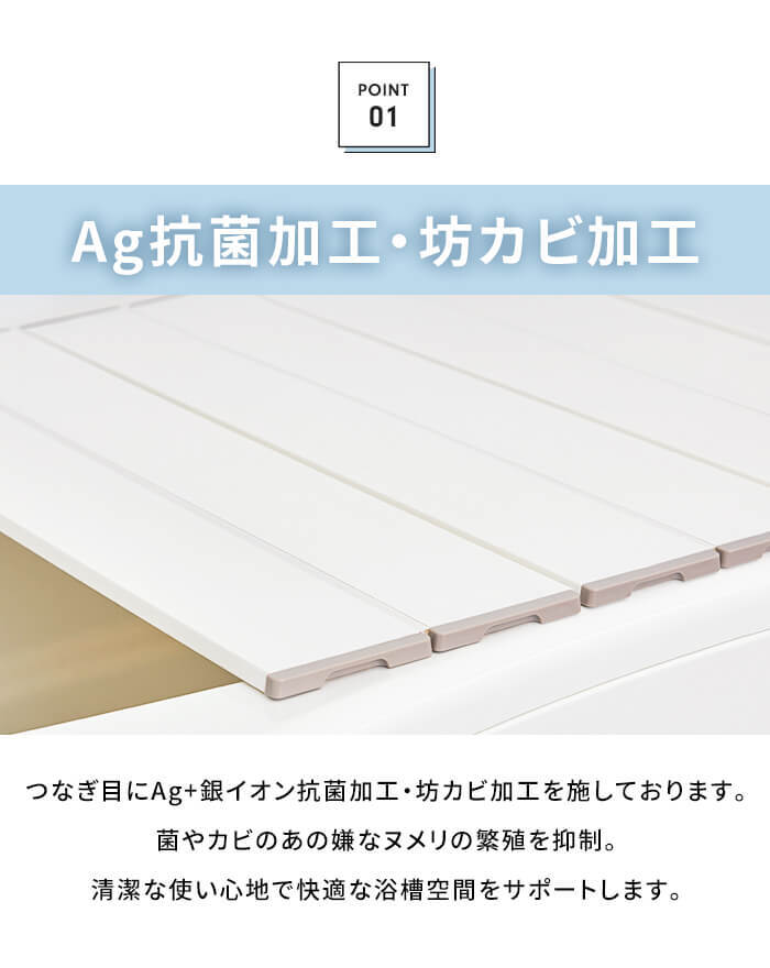 | Ag抗菌折りたたみ式 風呂ふた。 〔POINT〕Ag抗菌加工&防カビ加工 繋ぎ目にAg+銀イオン抗菌加工が施してあり、菌やカビによる嫌なヌメリの繁殖を抑えて風呂ふたをきれいに保ちます。 〔POINT〕フラットな形状でお風呂掃除が簡単 表面・裏面がフラットな形状で軽く洗って水を流せばお掃除完了。 (風呂ふたを洗う際は柔らかいスポンジや中性浴室用洗剤を使用してください。) 〔POINT〕コンパクトにたためてすっきり収納 折りたたみ幅約10センチと場所を取らなず省スペースで収納OK。 パタパタ広げて設置、重ね合わせて収納完了。 〔POINT〕軽量設計 毎日使うものだから軽量でストレスフリーな使い心地。 軽量なのでお子様からお年寄りの方でも簡単に扱えます。 〔POINT〕安心・安全の日本製 【使用上のご注意】 ◎購入直後は折りたたみクセが残っていることがありますが、徐々に解消していきます。 ◎24時間風呂ではご使用をお避け下さい。 ◎風呂水洗浄剤(塩素殺菌剤)をご使用しないでください。 ◎柑橘類(柚子・みかん・レモンなど)を使用しますと風呂ふたを傷める恐れがあります。 ◎ベビーバスなどを風呂ふたに乗せて使用しないでください。 |