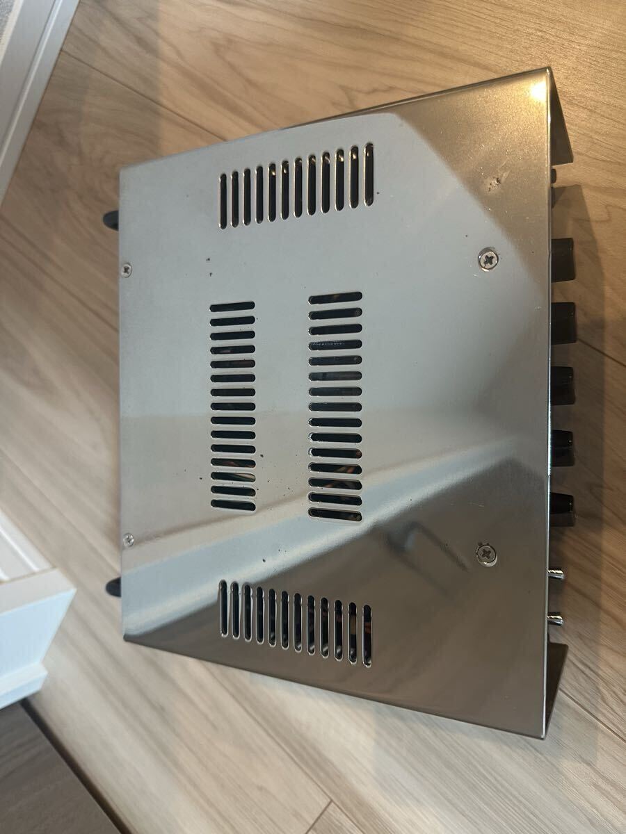 メタリック仕上げのCAJ TUBE TOP真空管アンプ、ラインアウトとスピーカーアウトを備え、音質調整が可能です。