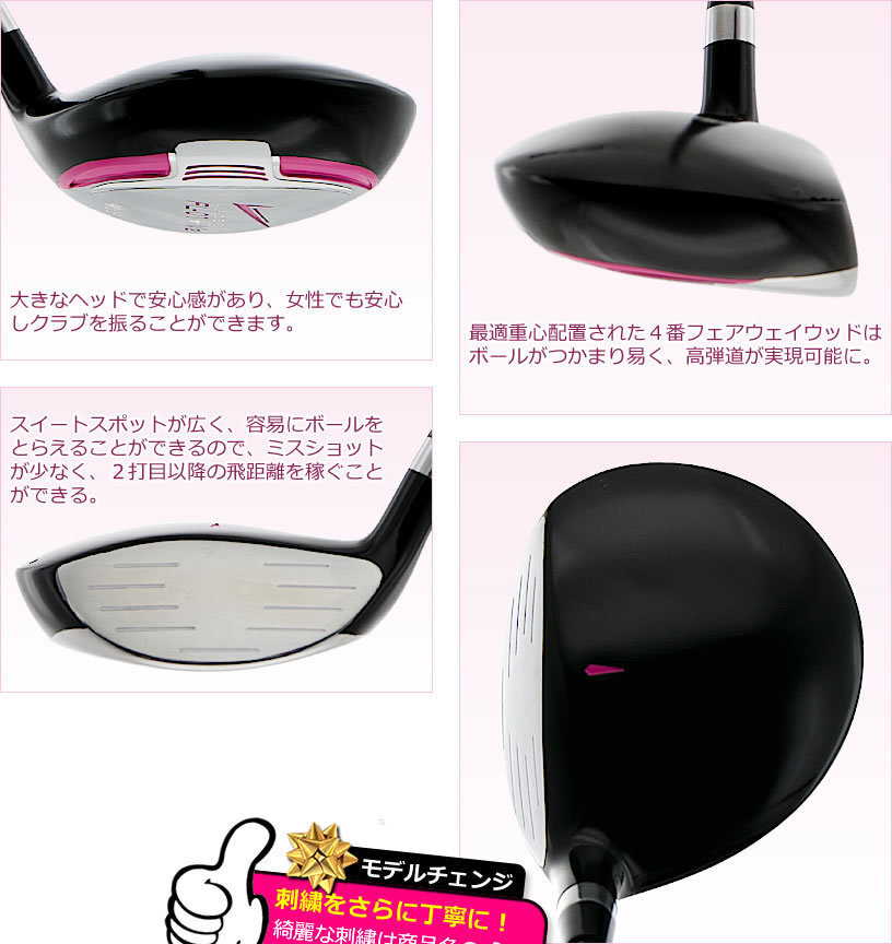 ★ ドライバーは、打ち出し角度の高さ、飛距離、そして方向性重視の450cc大型ヘッドを採用。前回のシャロー設計から今回はフェイス面をより大きくしロフト角を13°に設定!全体の重量を305gまで軽量化。女性ゴルファーのスイングヒッターには最適なロングドライブを実現!構えたときの安心感・フィーリングのよさを保ちつつクローズワイドスィートエリア設計!芯を外しても安定した飛距離&高弾道。