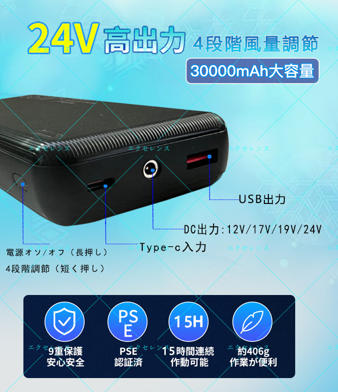 | 商品説明 | ★【セット内容】 30000mAhバッテリー*1、 ファン*2 、 DC接続ケーブル*1、 接続ケーブル*1 。 ★【24V超高出力&作業服専用 ファンバッテリーセット】夏最新、空調作業服ファンは航空力学を応用した流線型3枚大面積羽根が搭載して、風の抵抗を35%低減し、風が中心に集まり直進性が高く、パワフルな風を生み出します。30000mAh大容量専用バッテリーが搭載され、ワンボタンで12V-17V-19V-24Vに4段階切り替えるだけでなく、同類製品に比べると24V最強風量モードでもパワーが一定で、風量が弱くならないでずっと115リットル/秒で服内に暴風を送ります。真夏のべたつく汗、焼けつくような日差し対策として活躍します。 ★【24V超高出力&30000mAh大容量&4段階風量調】24V高出力バッテリーは、暑い夏の作業環境を一変するパワフルな大風量を実現!更に、30000mAhの大容量があり、24Vで10~12時間まで連続稼働できます。驚くほどの爆風が、より長時間維持できます。 DCケーブルで作業服ファとバッテリーを接続して、バッテリーの電源ポタンを押すと、12V-17V-19V-24Vの順番に調整できます。 ★【取り付け簡単】ファン取り付け部の直径サイズは9cmで、市販の90%の空調作業服、空調ベスト、空調パンツに対応でき、互換性が非常に高いです。何の道具も使わず、両手で空調作業服ファンカバーを回すだけで、2秒で簡単にファンカバーを取り外すことができます。ケーブルの接続不良はファンの電力供給が不安定で自動的にオフになるが、この新型扇風機にはプラグ固定用のフックを追加して、プラグをしっかり固定することができ、接続が緊密になり、ファンへの給電がもっと安定となります。アウトドア、ガーデニング、倉庫作業、農作業、建築現場、運送業などの作業着としてはもちろん暑さ対策ウェアとしても完璧です。 |
