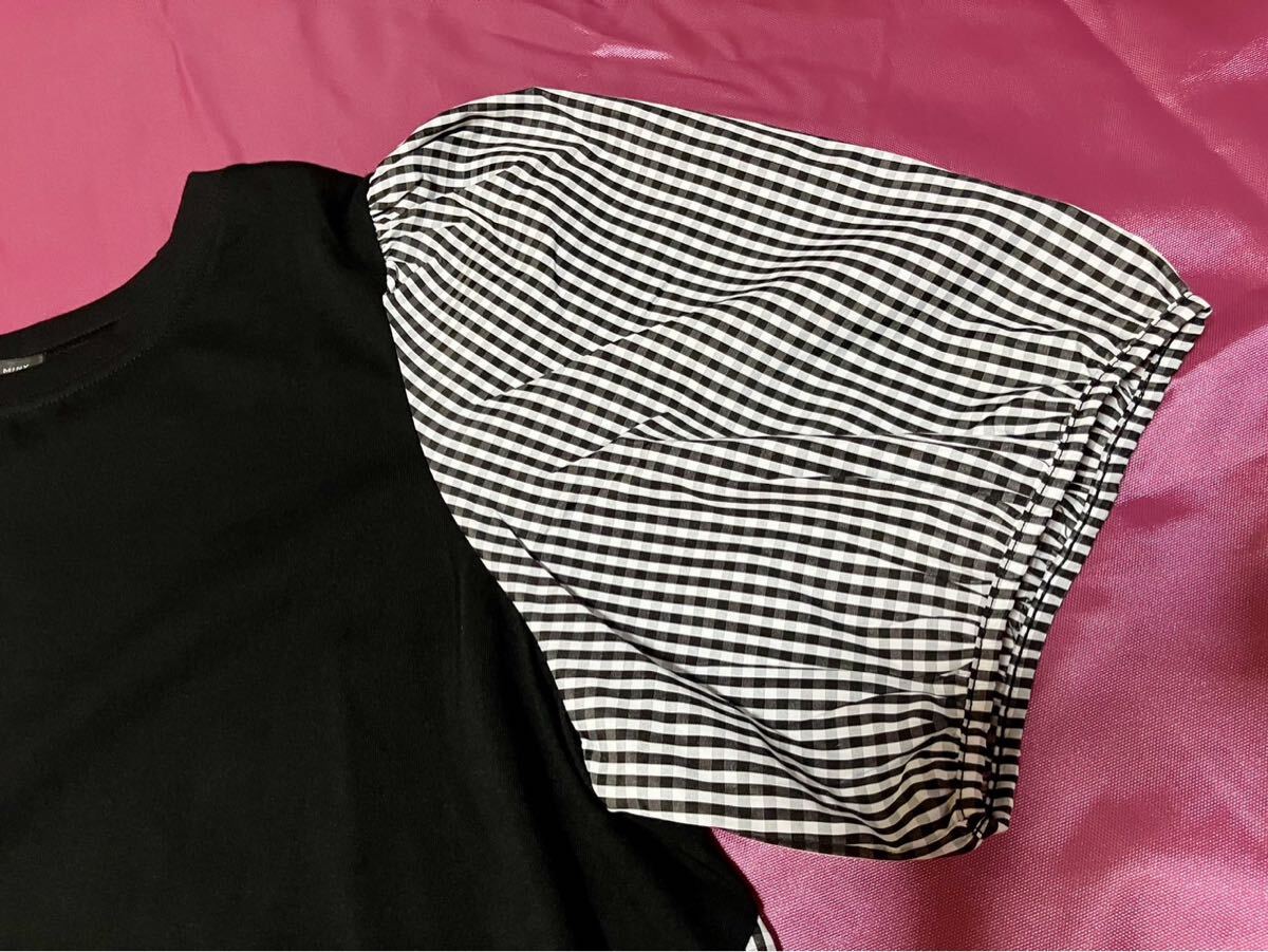 袖とワキ部分がギンガムチェックキリカエデザインになった半袖カットソーになります♪