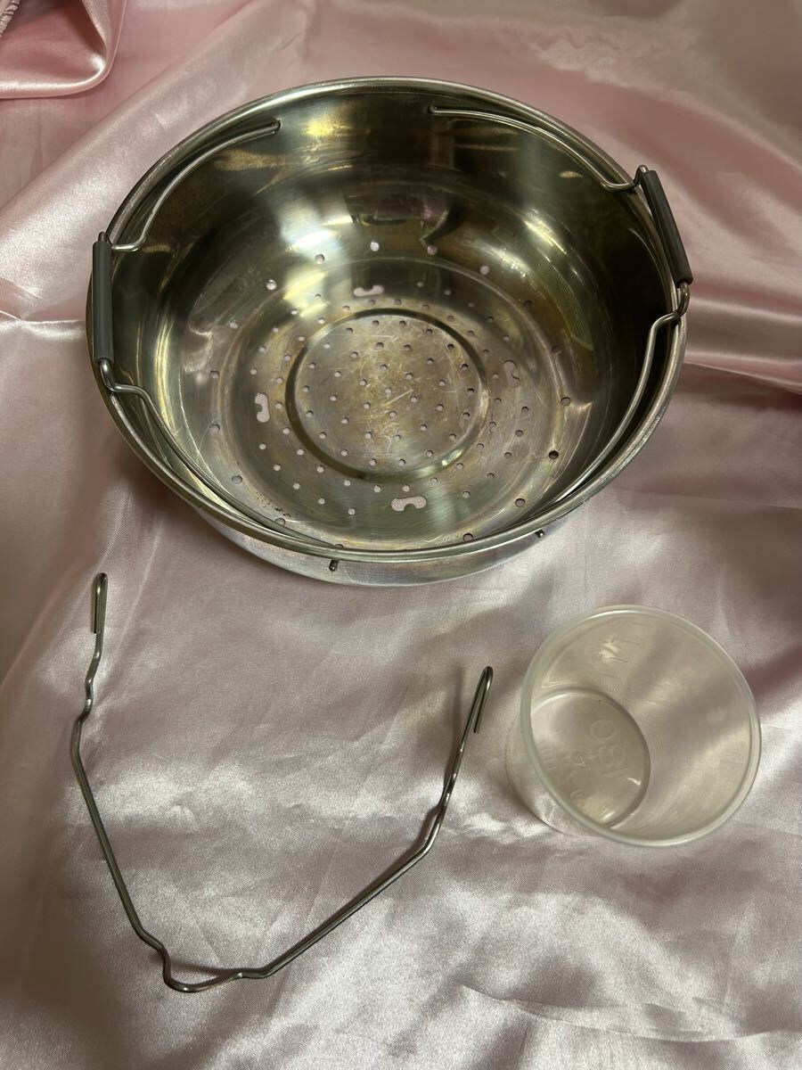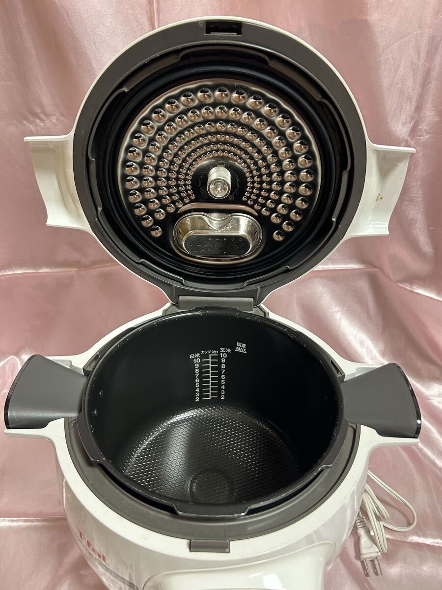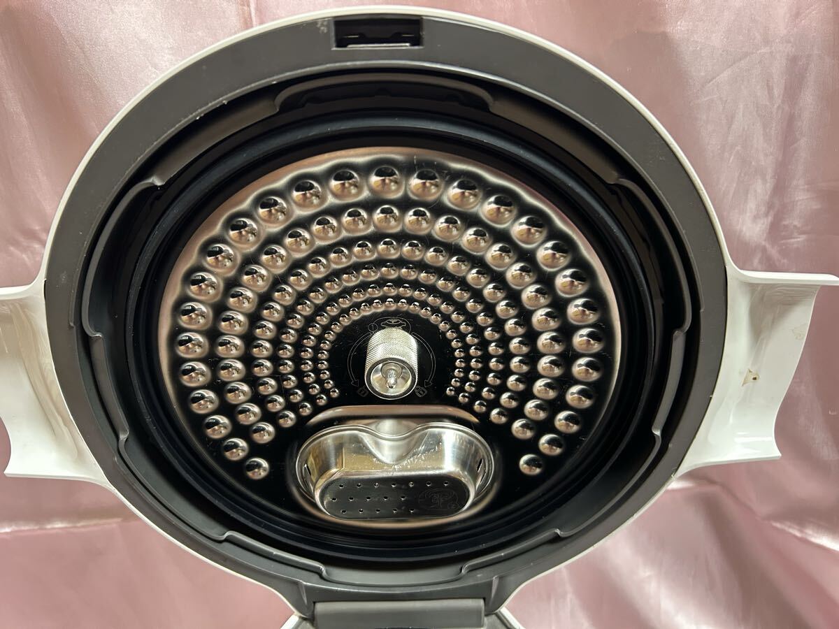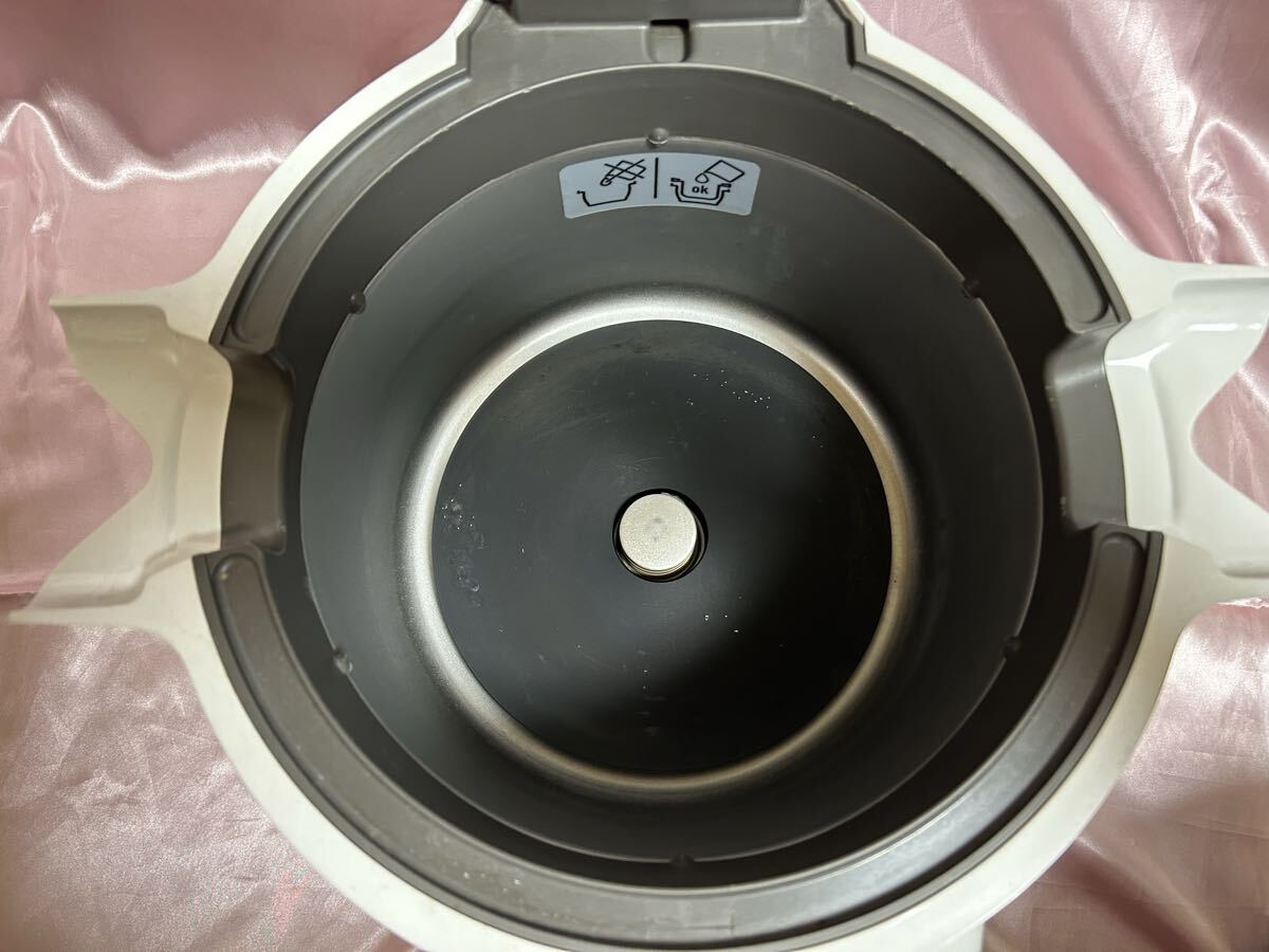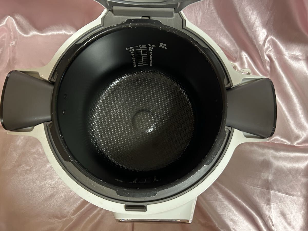 5、6年前に購入した物で購入時は時々使っていましたが最近の2、3年は殆ど使ってませんでした。内釜には傷がついているのと、蒸しかごの黄ばみなどの汚れはあります。外側はそれほど汚れてはいないような感じに見えます。あと、付属の計量カップがこちらの商品に付属の物だったのかは確かではありませんが使えると思います。