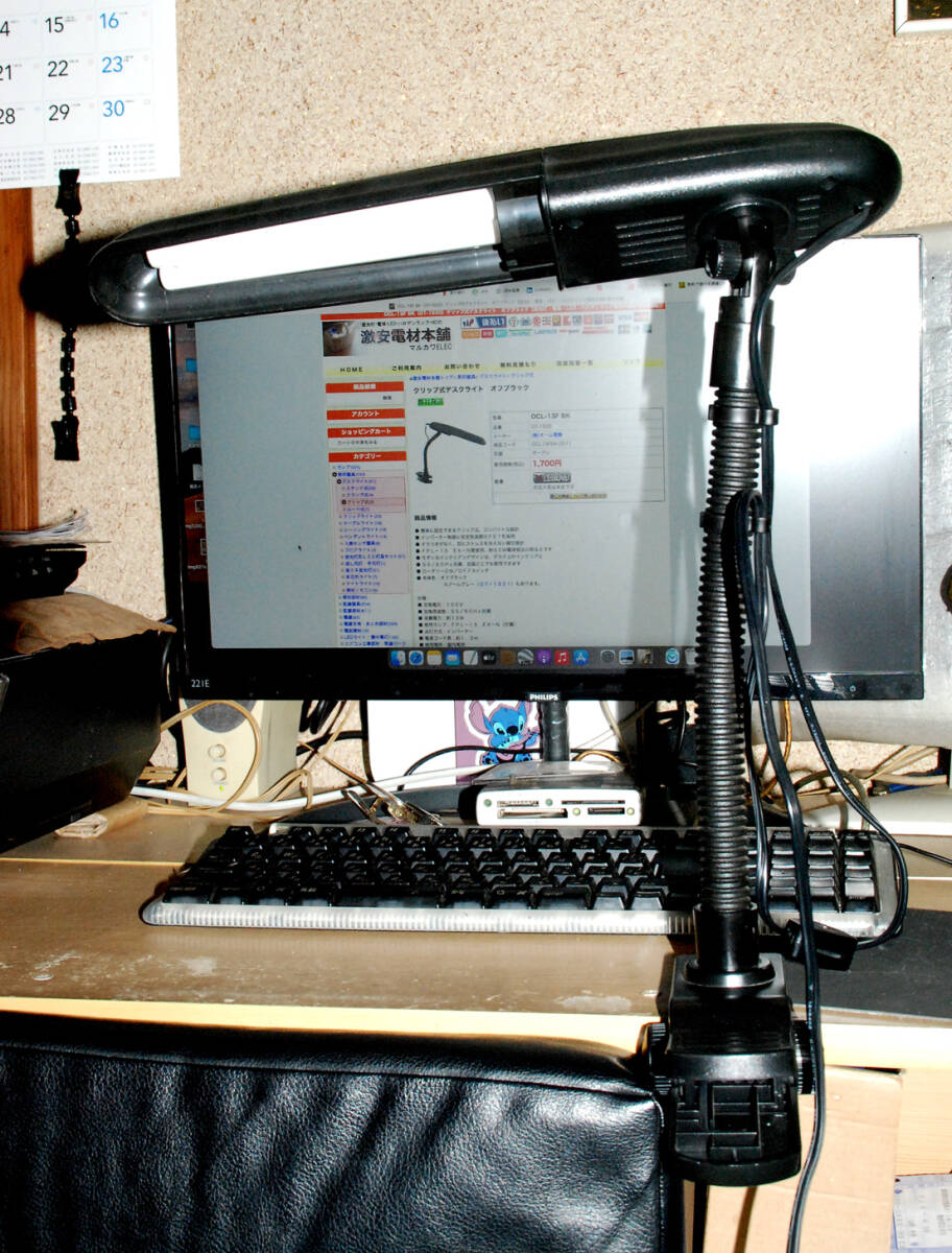 | * 商品説明 * オーム電気のクリップ式卓上蛍光灯スタンド「OCL-13F ブラック」です。未使用品ではありませんが、特に目立つ傷や汚れは無くキレイです。最高は約37.5cm、幅は約35.5cmです。電球部のみで40度ほど、付け根のネジ部分で180度ほど照射向きを動かせます。軸もある程度自在に動かせます。机などに噛ませるグリップ式ですので、このままでは立たせることは出来ませんが、板状の物を噛ませれば立たせることも出来ると思います。ネットで見ますと現状でも蛍光管は販売されているようです。お役立て下さい。 |