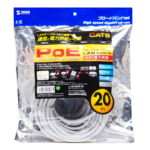 ※配送の送り主はサンワサプライ(株)と記載されています。沖縄・離島配送不可となります。 当店は正規販売代理店です。 特長 LANケーブル1本でLAN機器への信号通信と電力供給が可能なPoE(パワーオーバーイーサネット)完全対応のカテゴリ6LANケーブルです。 22AWG芯線仕様で、48V電力供給にも完全対応しています。PoEをはじめ、PoE+、UPoEにも対応しています。 伝送速度1000Mbps(1Gbps)のギガビットイーサネットに完全対応したカテゴリ6適合のLANケーブルです。 カテゴリ5eの2.5倍の伝送帯域250MHzを実現します。 ※ケーブルの線材が太く、コネクタ補強のため、コネクタにSTPコネクタを使用していますが、ケーブルはUTPケーブル仕様です。 気をつけておりますが、タイミングによっては在庫切れの場合があります。 <PoEとは?> PoEとは、LANの配線に使うイーサネット・ケーブル(UTPケーブル)を介して電力を供給する技術のことです。PoEの機能を備えたLANスイッチと、PoE対応の機器を組み合わせて利用すれば、データを送受信するためのイーサネット・ケーブルを通じて、LANスイッチからPoE対応機器へ電力を供給することができます。電源の確保が難しい場所に、ネットワーク接続する機器を設置する場合に適しています。具体的にはIP電話や無線LANのアクセスポイント、Webカメラなどで利用されています。 ※PoE対応の接続機器に限ります。 仕様