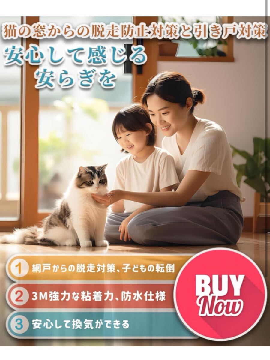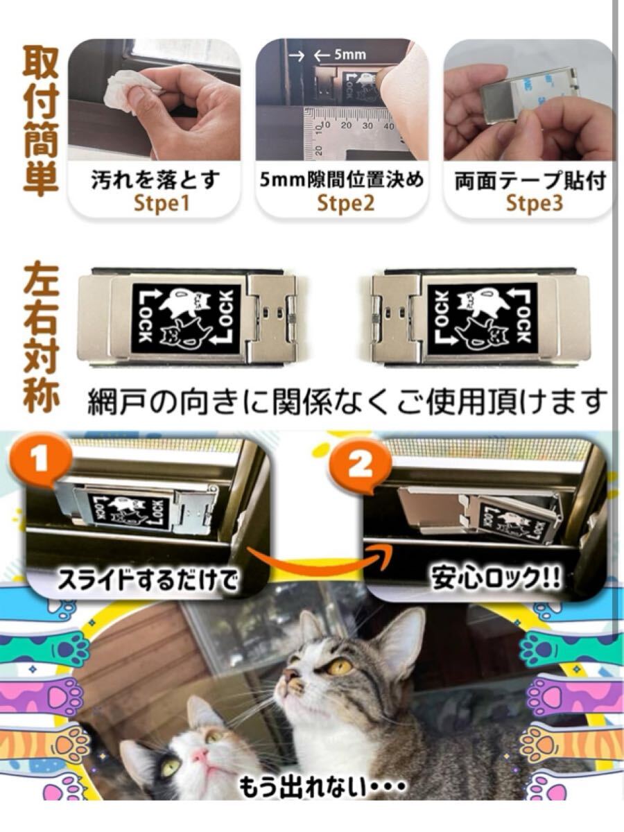 【取付簡単設置はたったの3ステップ】①汚れを落とす ②5mm隙間位置決め ③ 両面テープ貼付。「3 M」VHBシリーズの両面粘着テープを使用。さらに独自の加工で太陽光・熱に強く、剥がした後もテープ跡が残りません。ワンタッチで取付簡単!網戸ロック本体の後ろのテープをはがして窓ストッパーに貼るだけで猫ちゃんが脱走を諦めます。