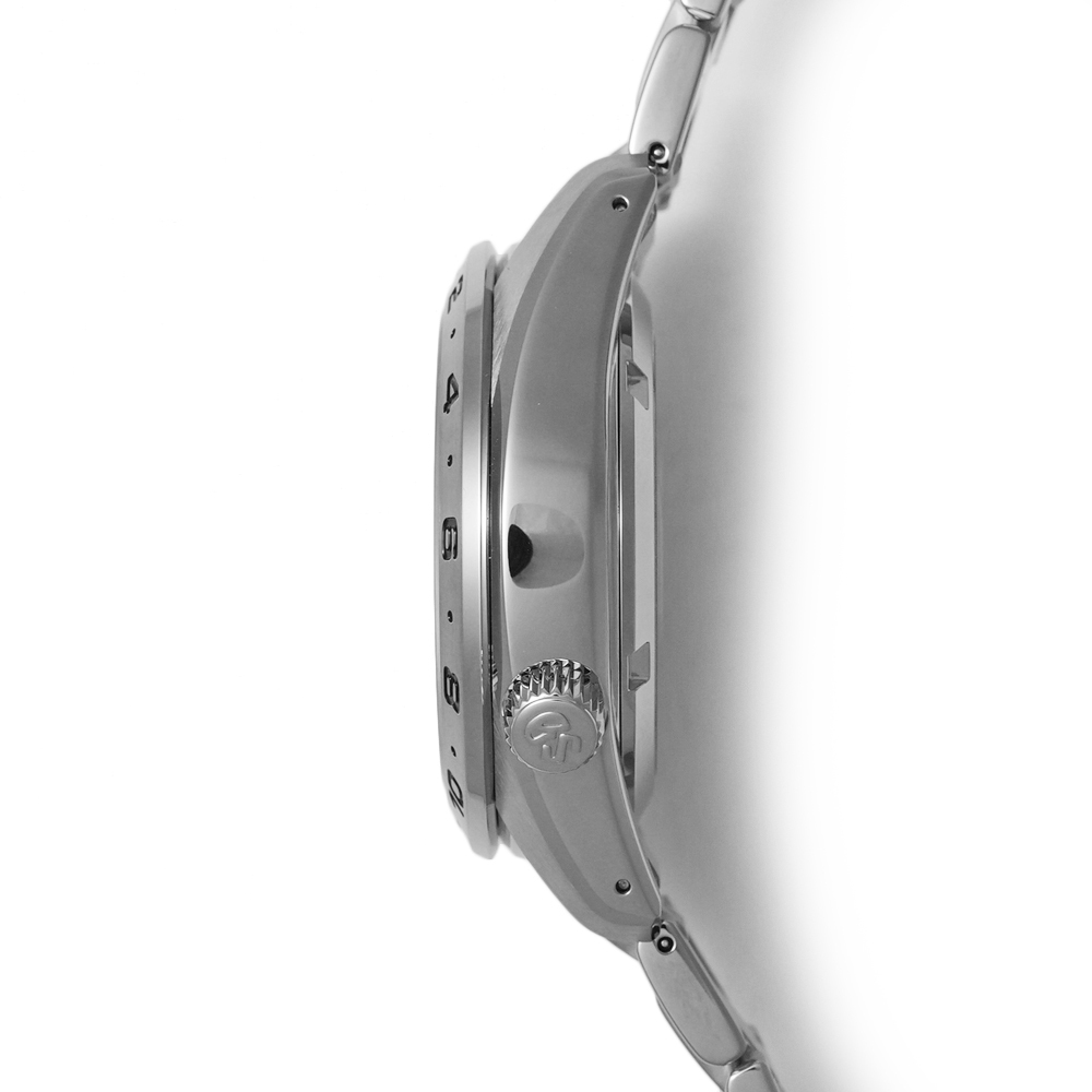 スーツにも週末スタイルにも映える、実用派スポーツGMT。ブルーダイヤルと立体インデックスが高い視認性と上質感を両立します。