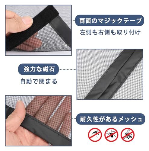 2【高品質・耐久性】他のナイロン網戸より耐久性が良いグラスファイバー素材の上、マグネット付き部に柔らかいウェビングでラッピングして二重縫い強度強化していますので、ほつれることはなく見た目も良く丈夫で長持ちできます。★ガラス繊維の素材で耐久性、難燃性、耐薬品性も優れて、紫外線の防止も効きます。強力的なマグネット付き出入り楽で安全にお使いいただけます。