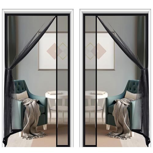 Lesimoll【両開き】玄関網戸 マグネット網戸 左右両開き式 ドア網戸 網戸カーテン マグネット開閉式 簡単網戸 虫除けカーテン 換気対策 18*16メッシュ ガラス繊維 黒 勝手口 入り口 簡単取り付け 両面マジックテープ付き 収納バンド付き(両開き-85x195cm)
