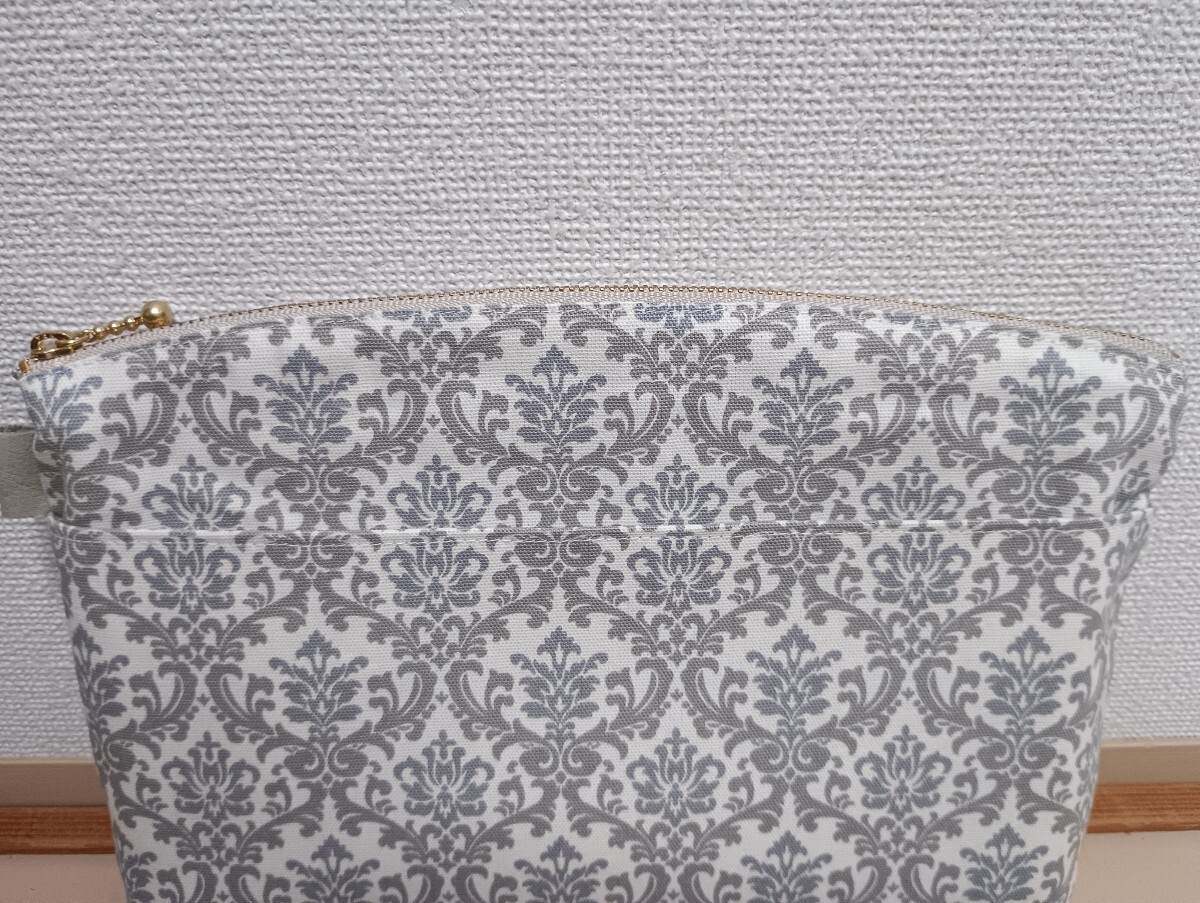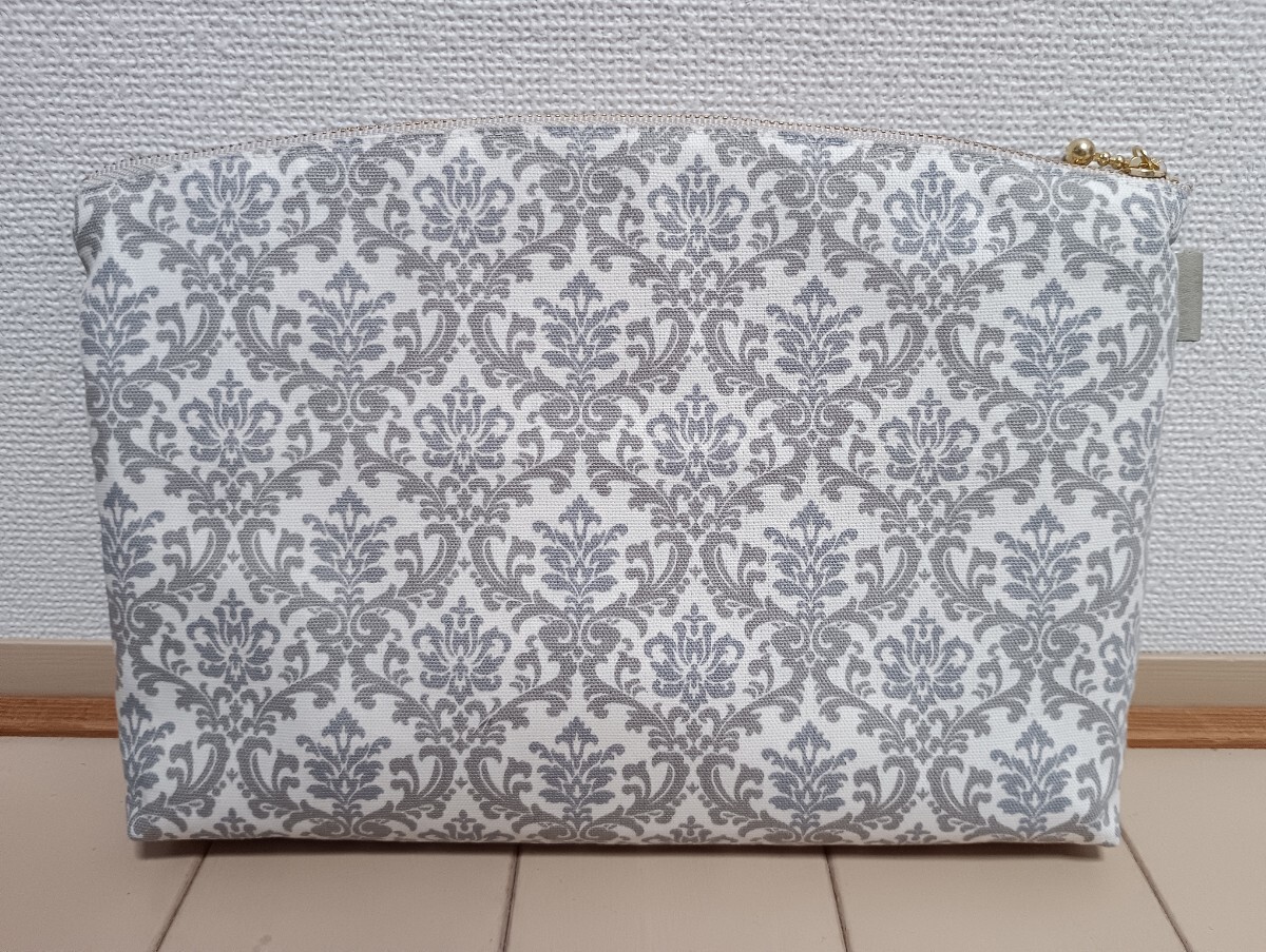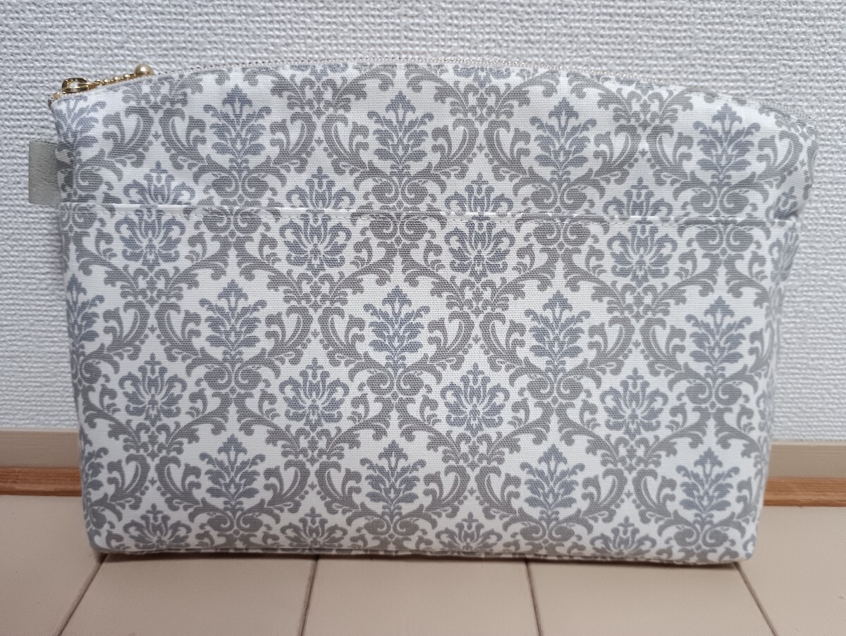 ハンドメイド  YUWA ブルーグレー&グレー色のダマスク柄の大きいポーチです。前にポケット付いてます。中は生成り生地です。