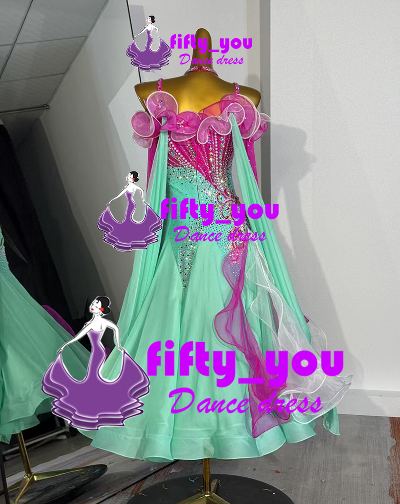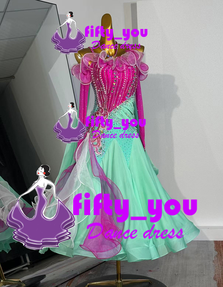 新品fifty_youレディース社交ダンス衣装 競技ドレス セミオーダー  高級モダンドレス  スタンダードドレス グリーン+濃いピンク