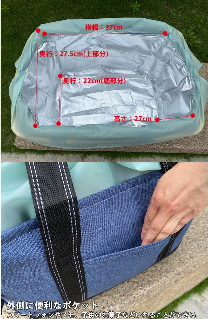 素材・材質:(生地)ポリエステル100%、(持ち手生地)ポリプロピレン、(中素材)アルミ蒸着シート、内側生地:PEVA
