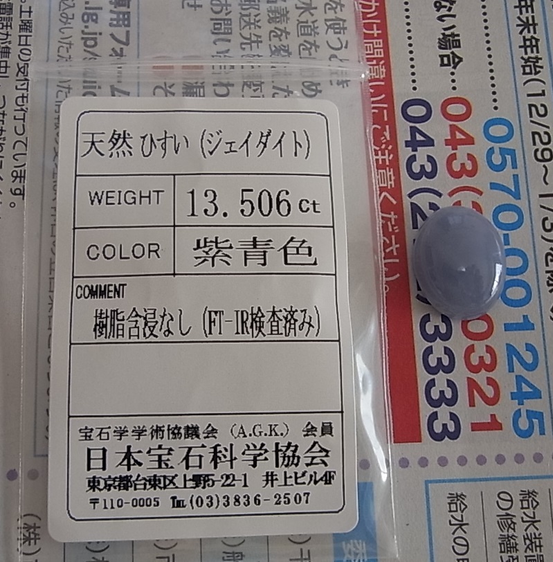 紫青色 翡翠 ルース 13.506ct ソーティング あり   検索 指輪 リング 鑑別書 鑑定書