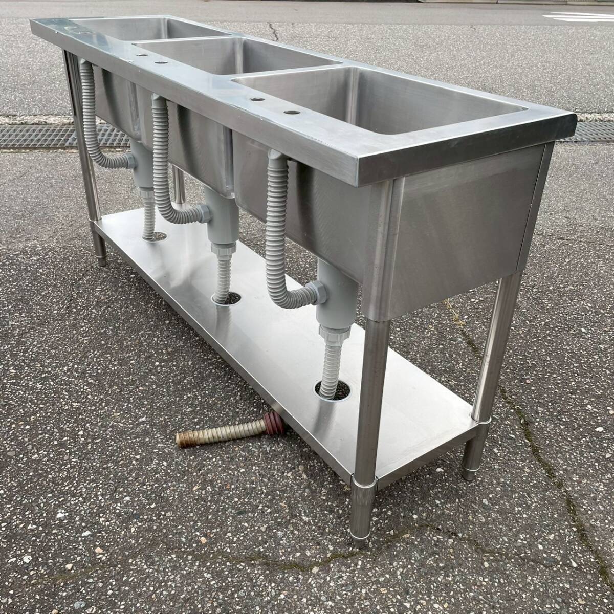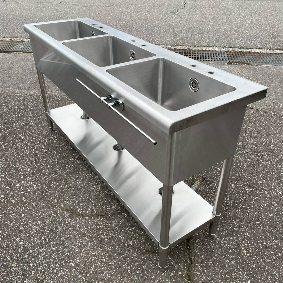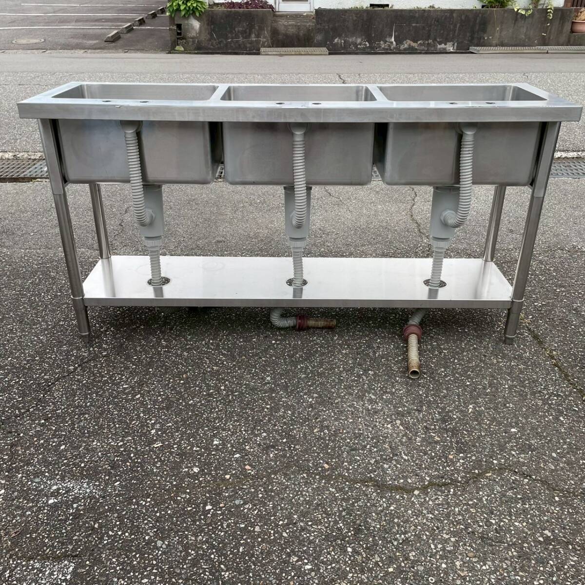 ステンレス製 3槽シンク 業務用 W1500×D450×H800 ステンレスシンク 厨房 厨房機器 店舗 店舗用品 流し台 水栓取付穴あり 状態良好 Y1769