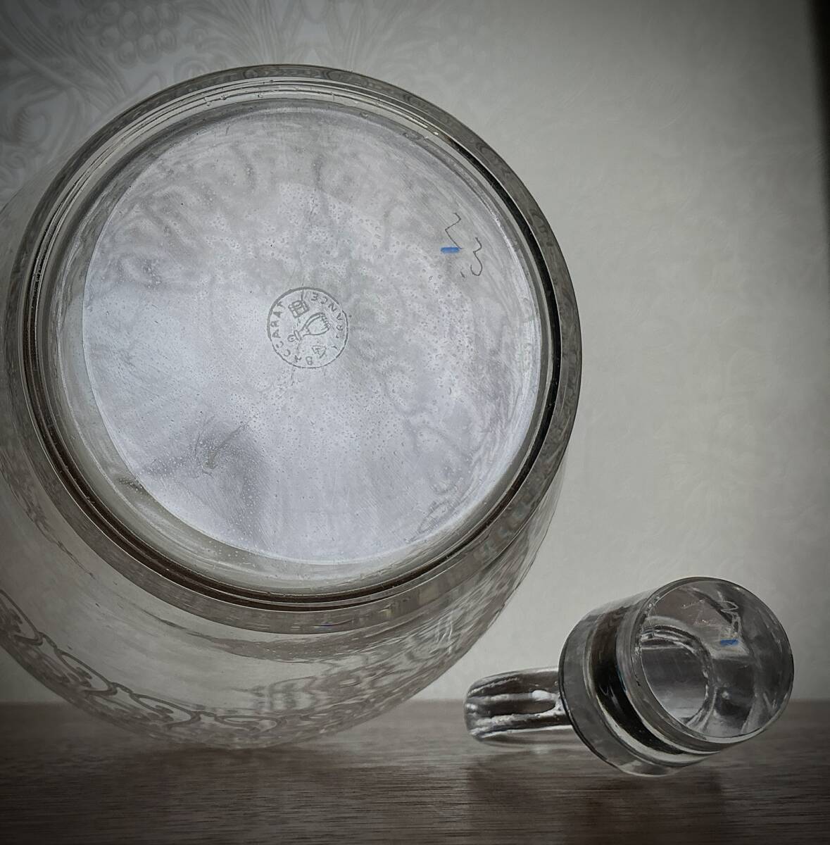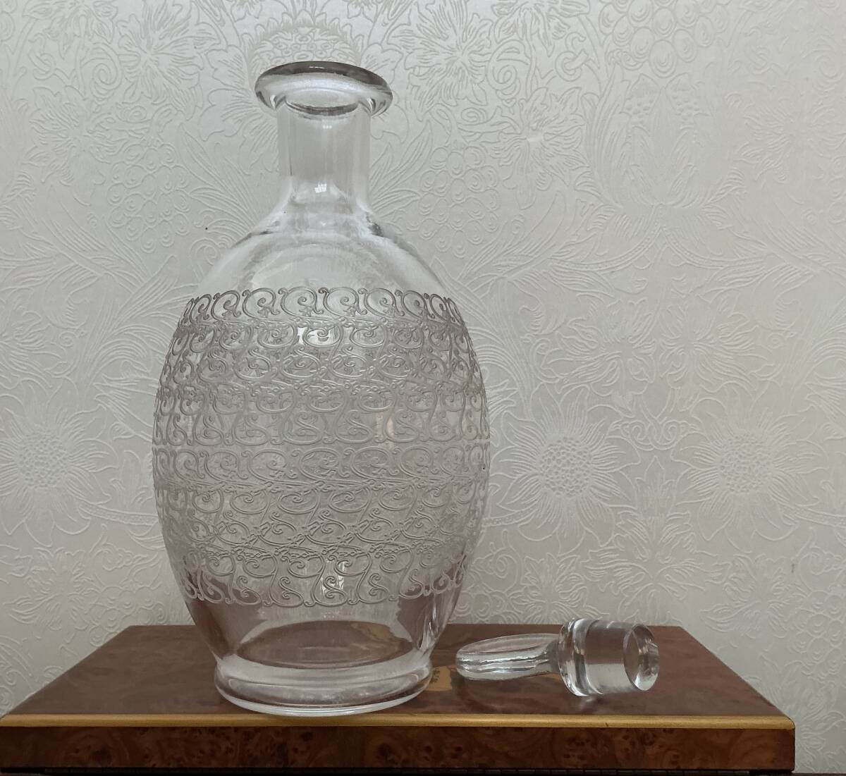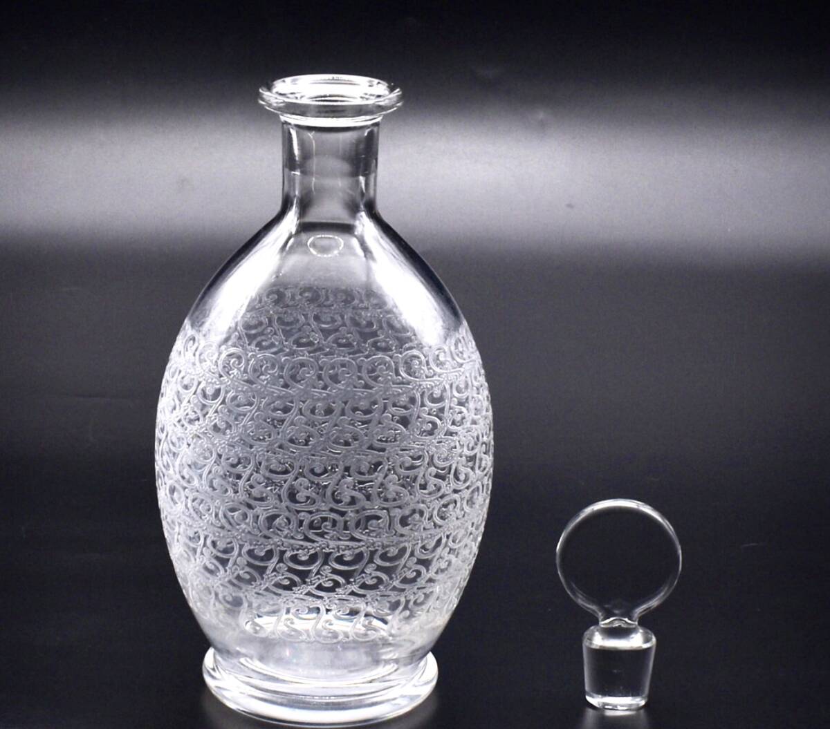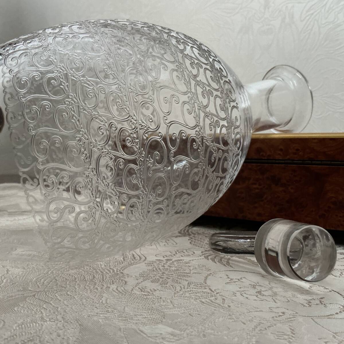 バカラ ローハン グヴィユー  デカンター の出品です。ローハンはバカラで製作されるグラスの中でも最も人気のあるモデルの一つで、胴廻り全体にバカラの代表的な装飾技法アシッド・エッチング(酸化腐食法)でS字型のアラベスク模様が繊細にグラヴィール描かれています。