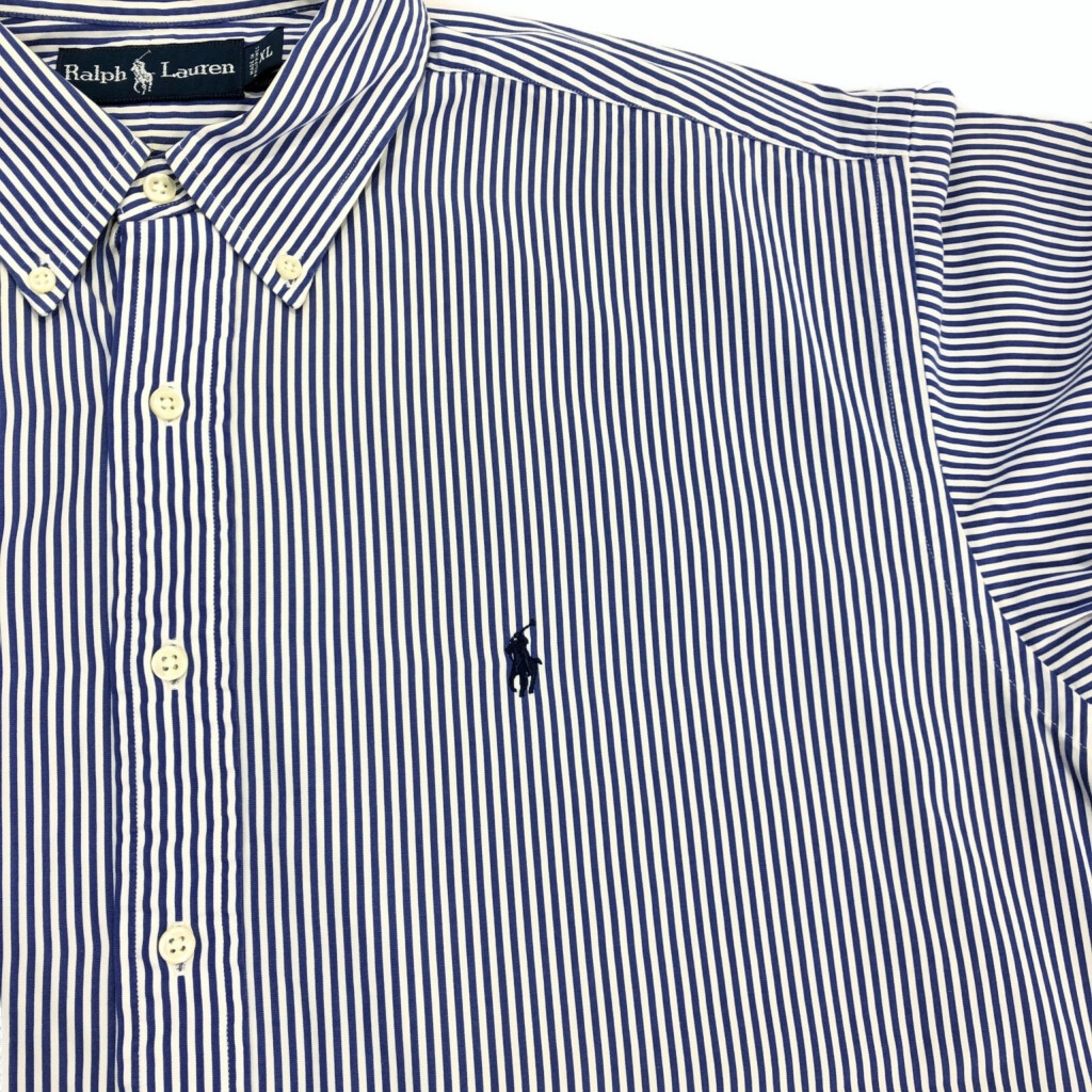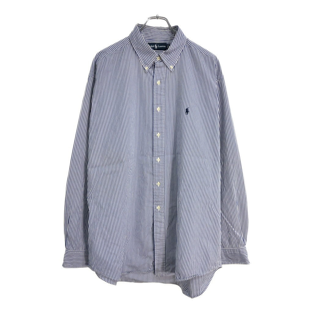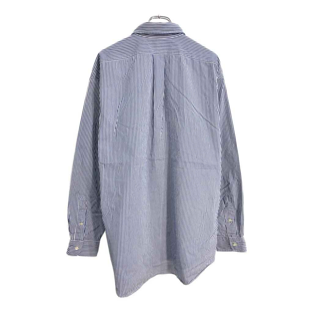 | [商品管理番号] U6518 [ブランド] Polo by Ralph Lauren/ポロ ラルフローレン [サイズ] XL [実寸サイズ] 肩幅:約54cm 着丈:約86cm 身幅:約72cm 袖丈:約63cm [主な素材] 表地 : コットン [色] ブルー [仕様] ボタンダウン ストライプ [状態] 汚れ:袖 | |||