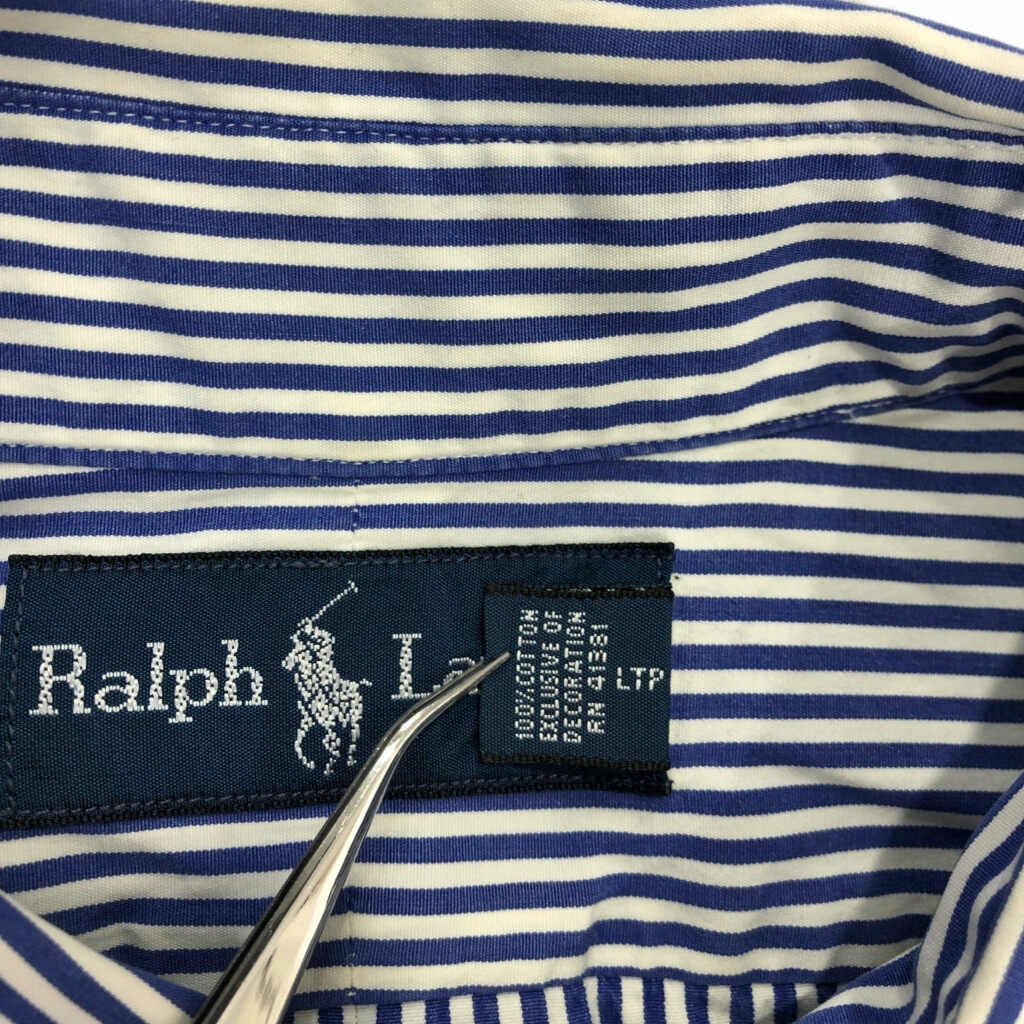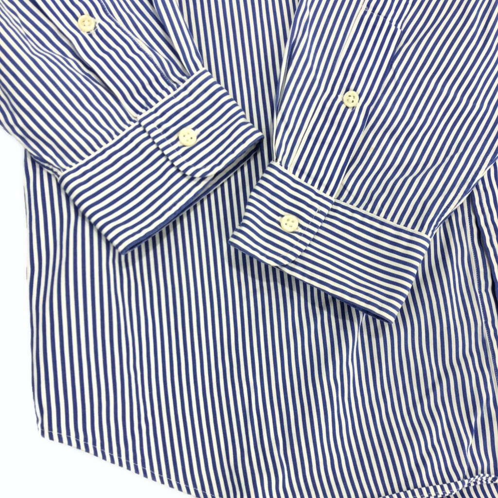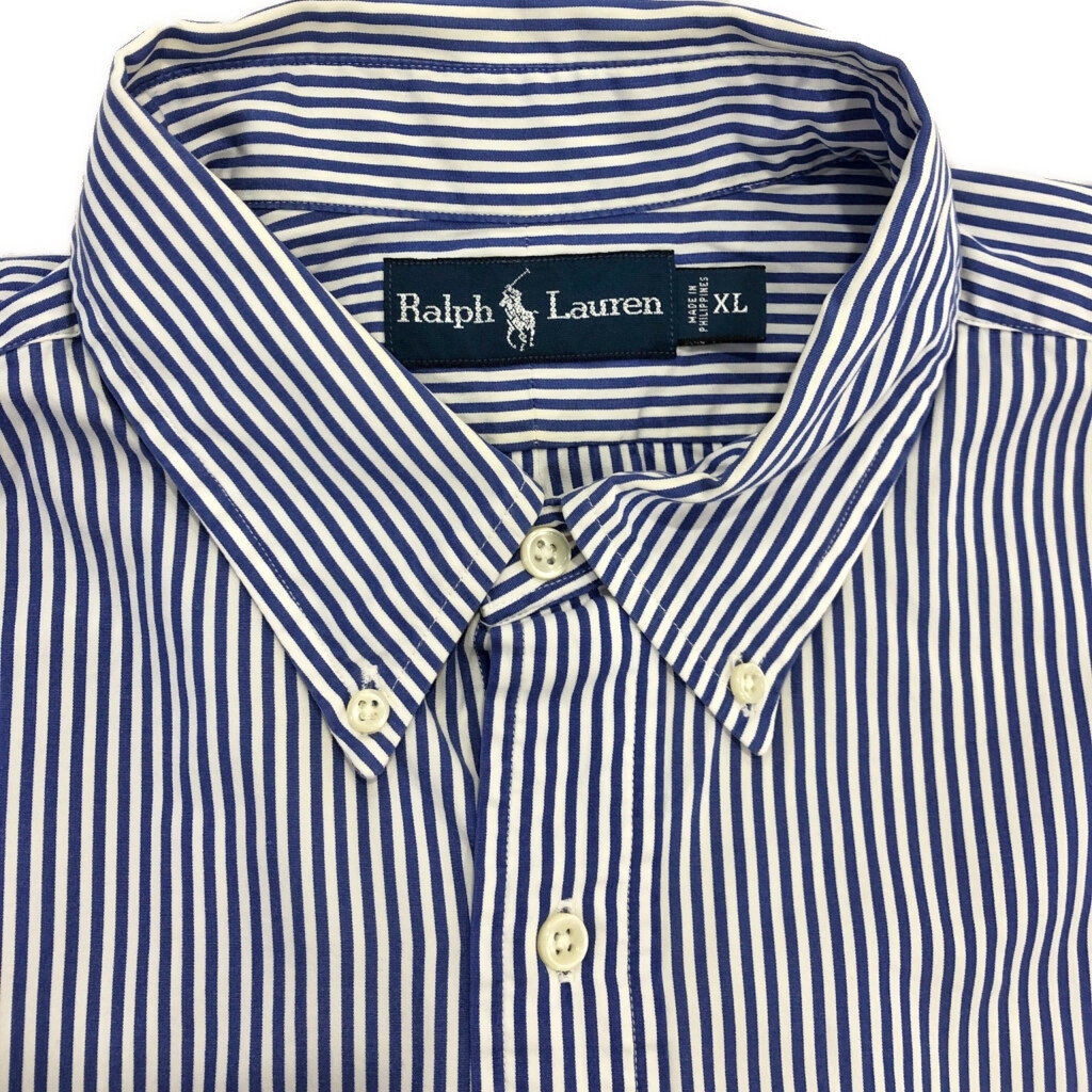 | [商品管理番号] U6518 [ブランド] Polo by Ralph Lauren/ポロ ラルフローレン [サイズ] XL [実寸サイズ] 肩幅:約54cm 着丈:約86cm 身幅:約72cm 袖丈:約63cm [主な素材] 表地 : コットン [色] ブルー [仕様] ボタンダウン ストライプ [状態] 汚れ:袖 | |||