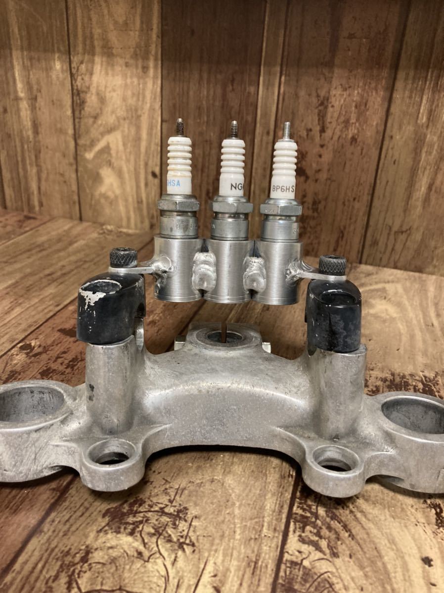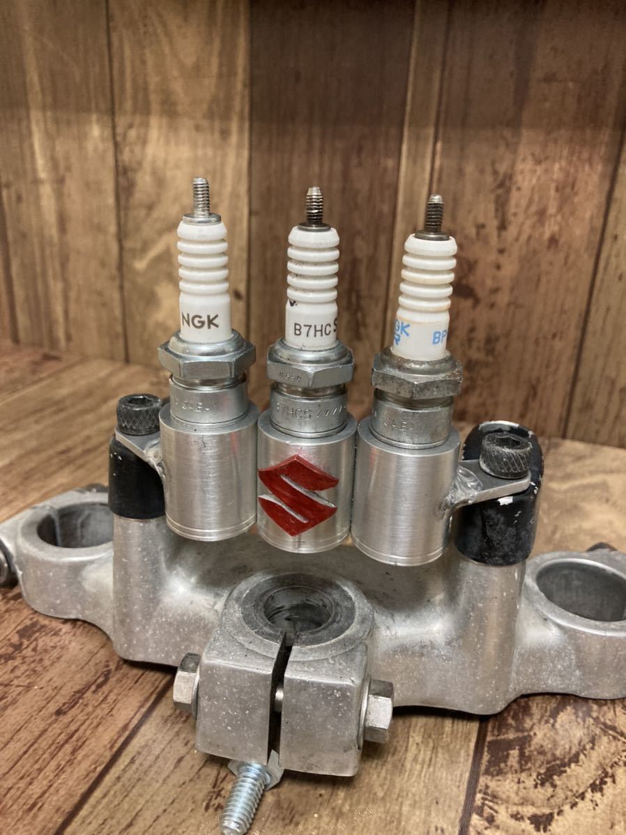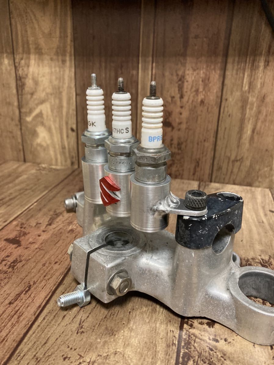 アルミの丸棒から削り出し溶接構造にて製作した品になります。予備のプラグを常備させておくアクセサリーパーツになります。取り付け穴ピッチが100ミリになってるのでgt550 gt750にも流用できると思いますがご購入される前にトップブリッジの穴ピッチを確認してからのご入札お願いします。
