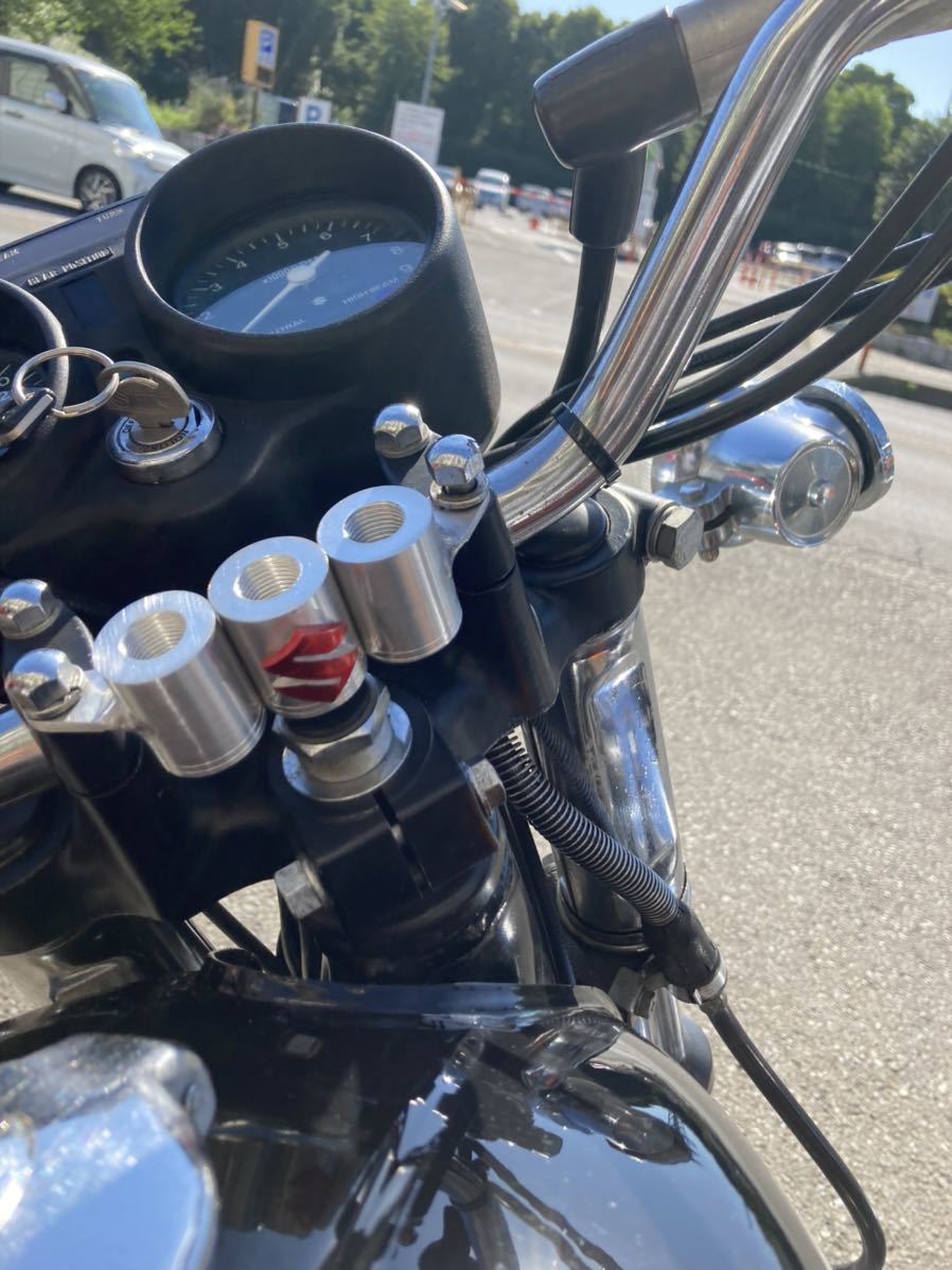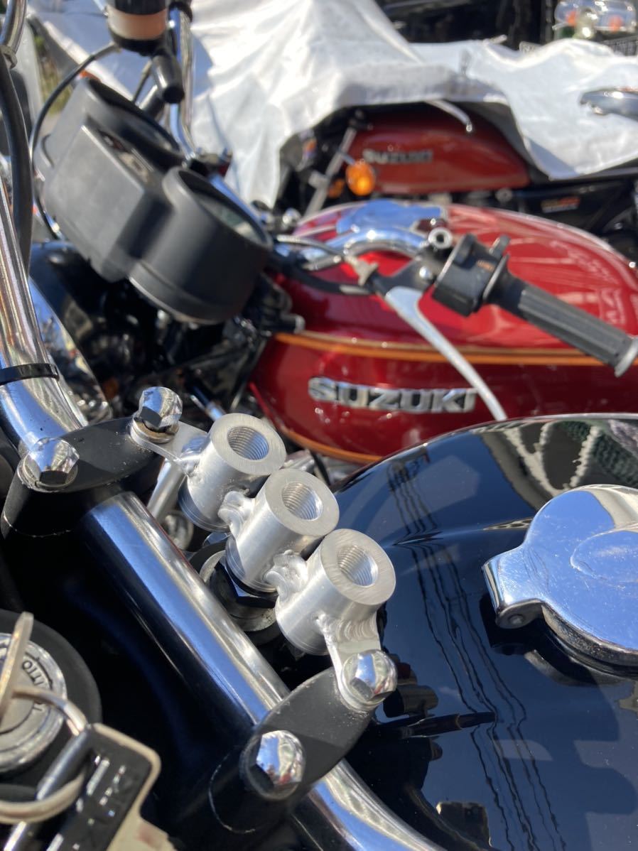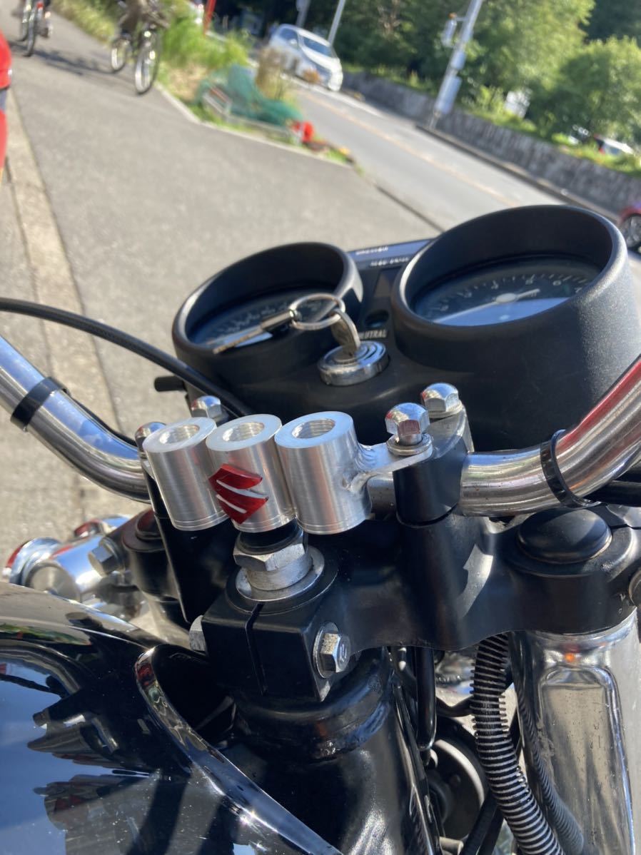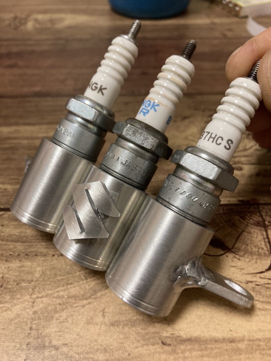 アルミの丸棒から削り出し溶接構造にて製作した品になります。予備のプラグを常備させておくアクセサリーパーツになります。取り付け穴ピッチが100ミリになってるのでgt550 gt750にも流用できると思いますがご購入される前にトップブリッジの穴ピッチを確認してからのご入札お願いします。