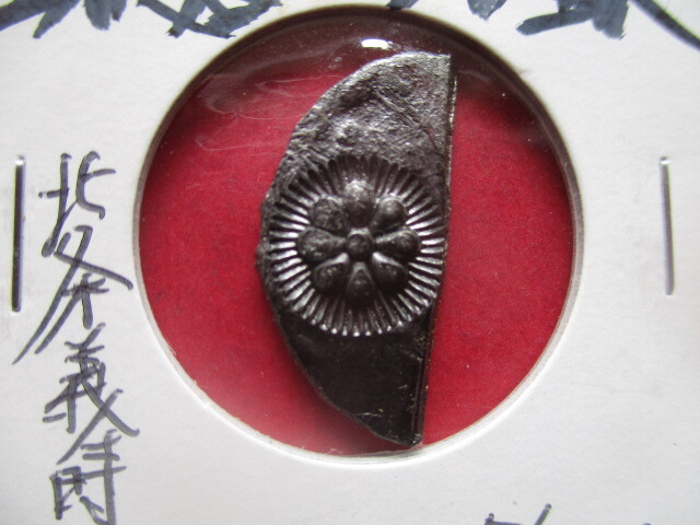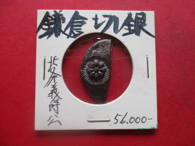 有力御家人が試鋳した切銀が普及するに至って幕府中枢の執権職も発行し、幕府公認の貨幣となりました。固有の花模様の刻印で発行した執権職が特定できますが、御家人鋳造の切銀より大きめの花模様で、しかも片面のみの刻印が特徴です。こちらはNHK大河ドラマ『鎌倉殿の13人』で主役となった二代執権の北条義時公によって発行されたと伝えられています。