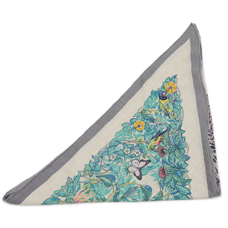 | 商品特徴 | カシミヤとシルクの混合素材が織りなす、しなやかな肌触りの大判トライアングルショールです。メゾンを象徴する動物モチーフの中でも特に人気の高い「JUNGLE LOVE」の柄が、色彩豊かに描かれています。独特の三角形のフォルムは、首元に巻いたり、肩にかけたりと、様々なアレンジを楽しめ、装いにエレガントな遊び心と華やかさを添える逸品です。 |