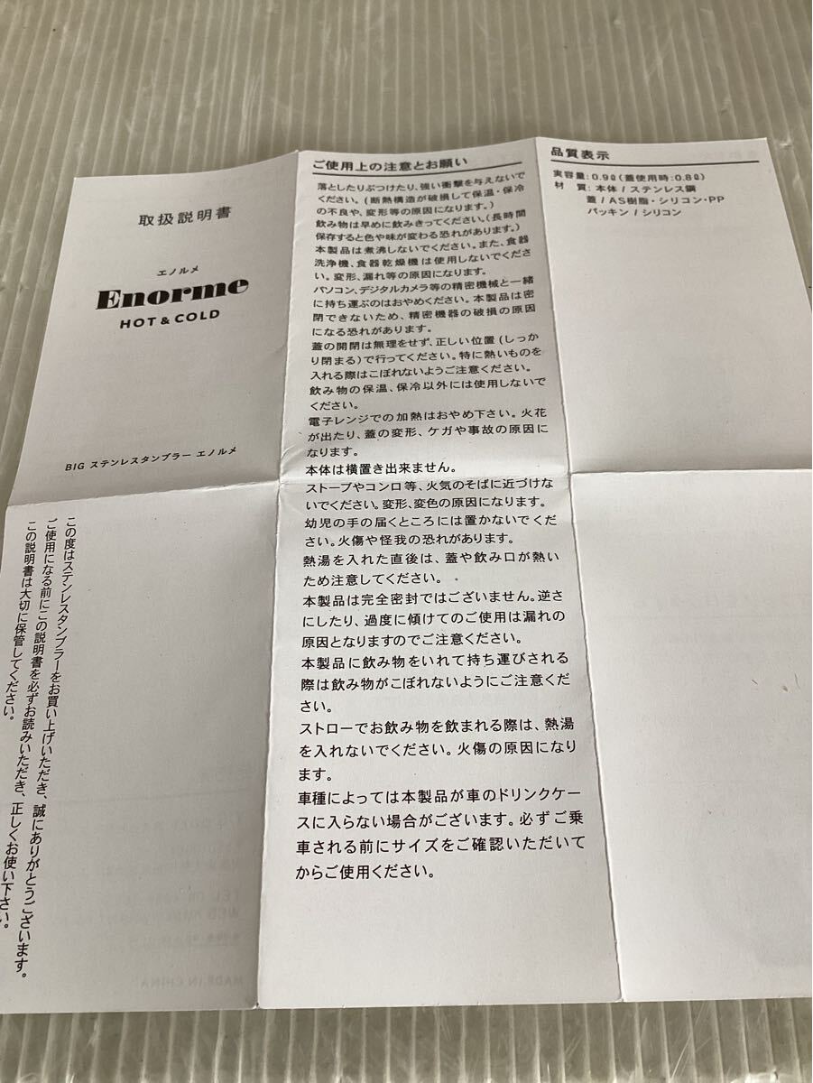 【K0499】Enormeエノルメ HOT&COLD BIGステンレスタンブラー 取手付き 0.9L 取扱説明書付き