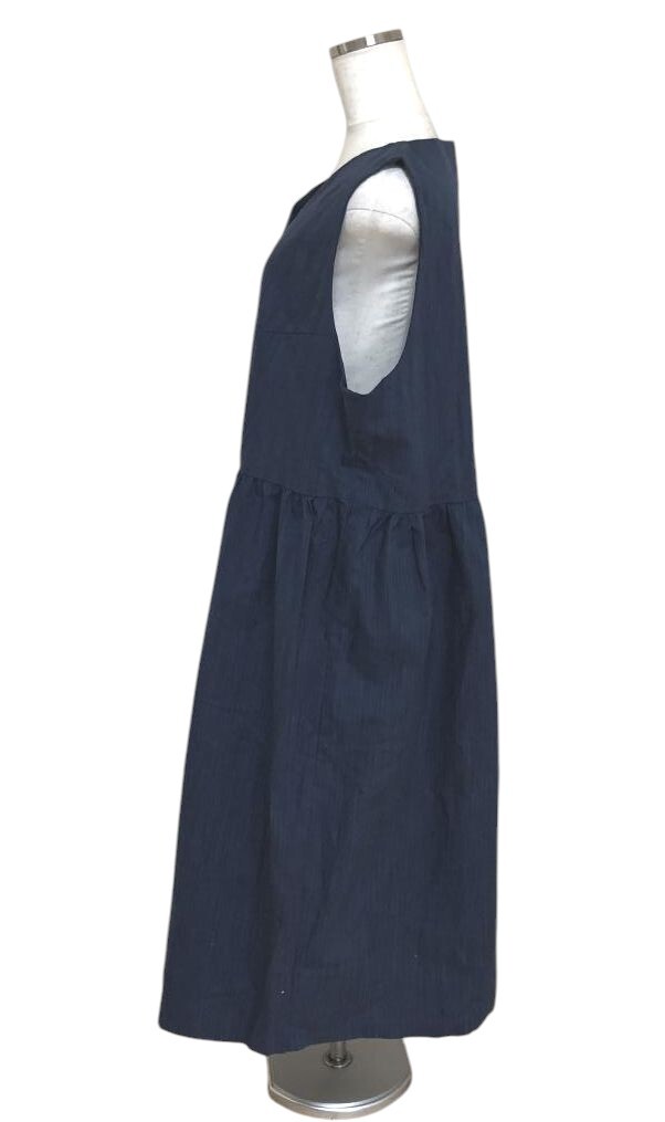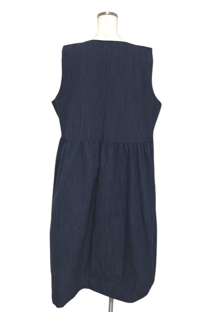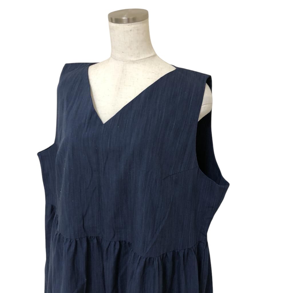 ◆ランク(商品の状態)◆S新品です。こちらは、ハンドメイドのレディース用ロングワンピースです。サイズは4Lとゆったりめで、透け感のない着心地の良いコットン素材を使用。ノースリーブです。お色はネイビー。首元をすっきり見せ、スタイルアップ効果も期待できます。ストレッチなしのナチュラルなコットン。透け感はなく、安心して一枚で着用可能。両サイドには便利なポケット付きで、実用性も兼ね備えています。大きいサイズでお探しの方におすすめの一着です。裏地なし。ファスナーなし。 ◆サイズ◆4L程度(サイズタグはありませんので実寸法をご確認ください)肩幅39 バスト118 ウエスト114 ヒップ160 着丈110 スカート部分丈72