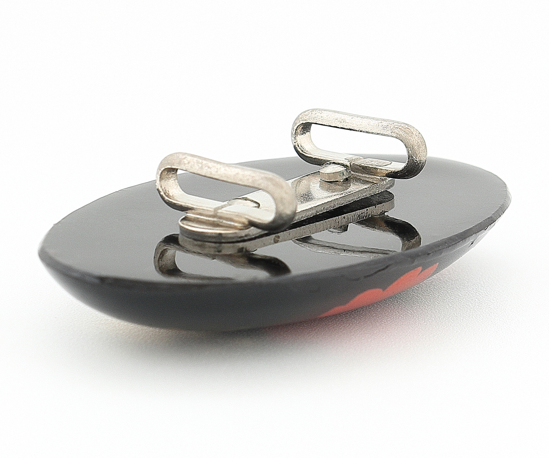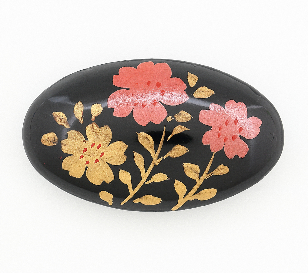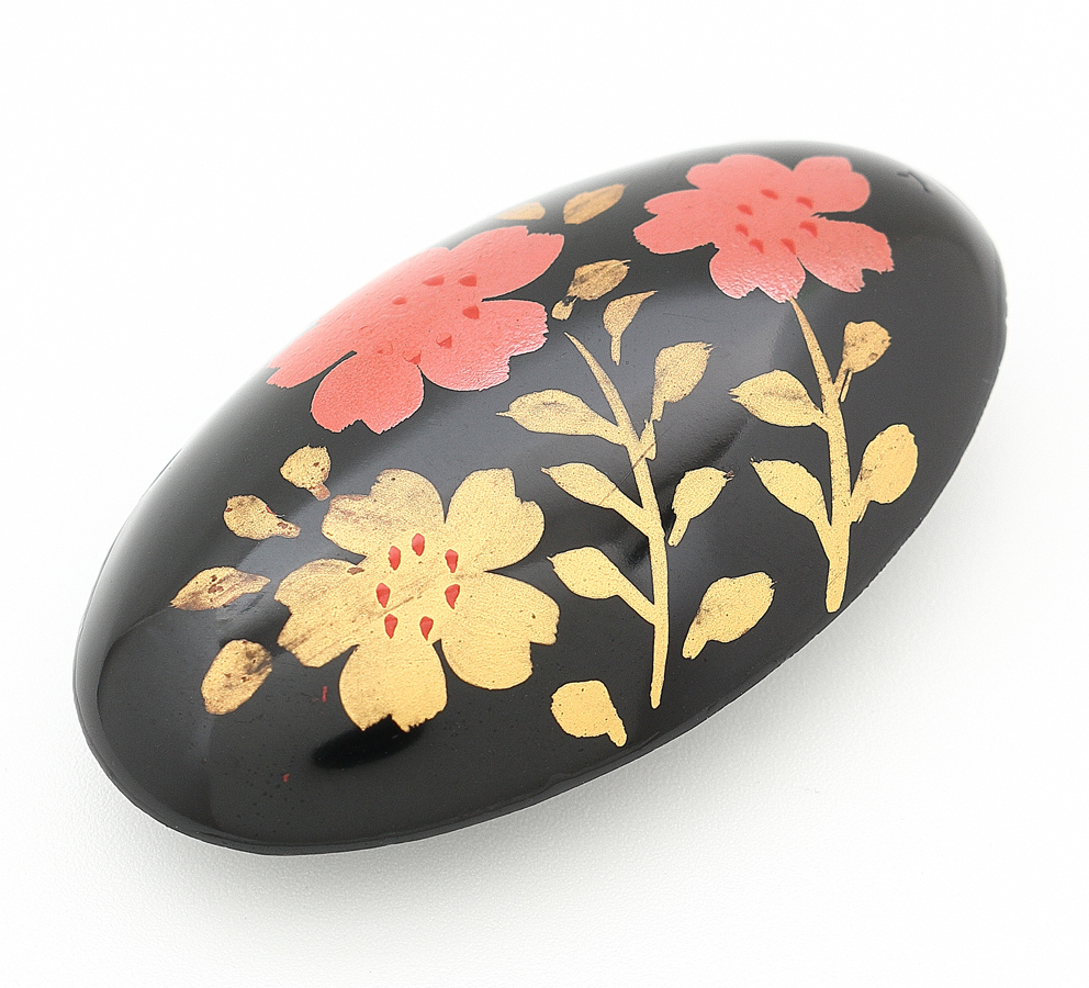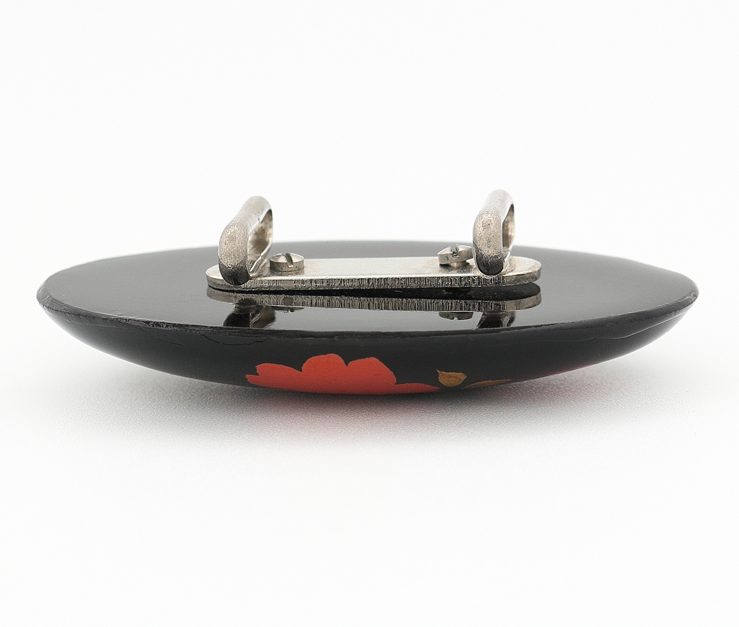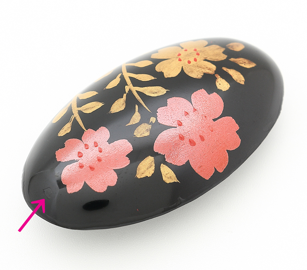 寸法・・・横4.8cm 縦2.8cm 紐穴の内幅11mm 状態・・・画像矢印部分に小さな漆剥がれあり 詳細・・・漆塗り 蒔絵 帯留 | |