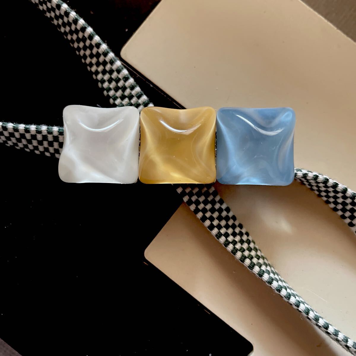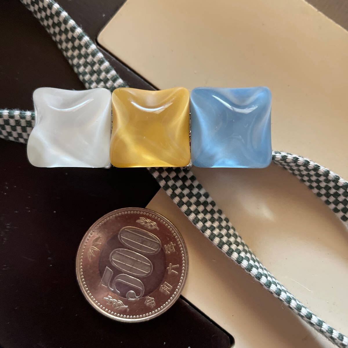軽いつけ心地の樹脂製の帯留めです。