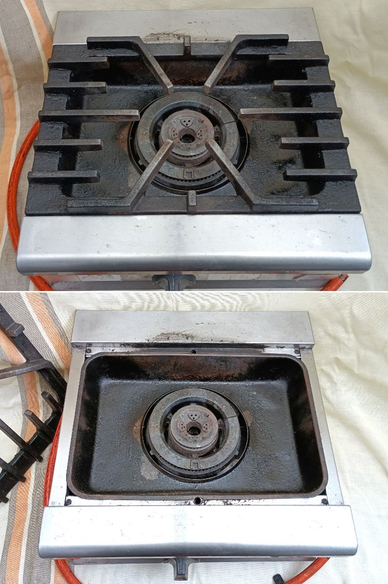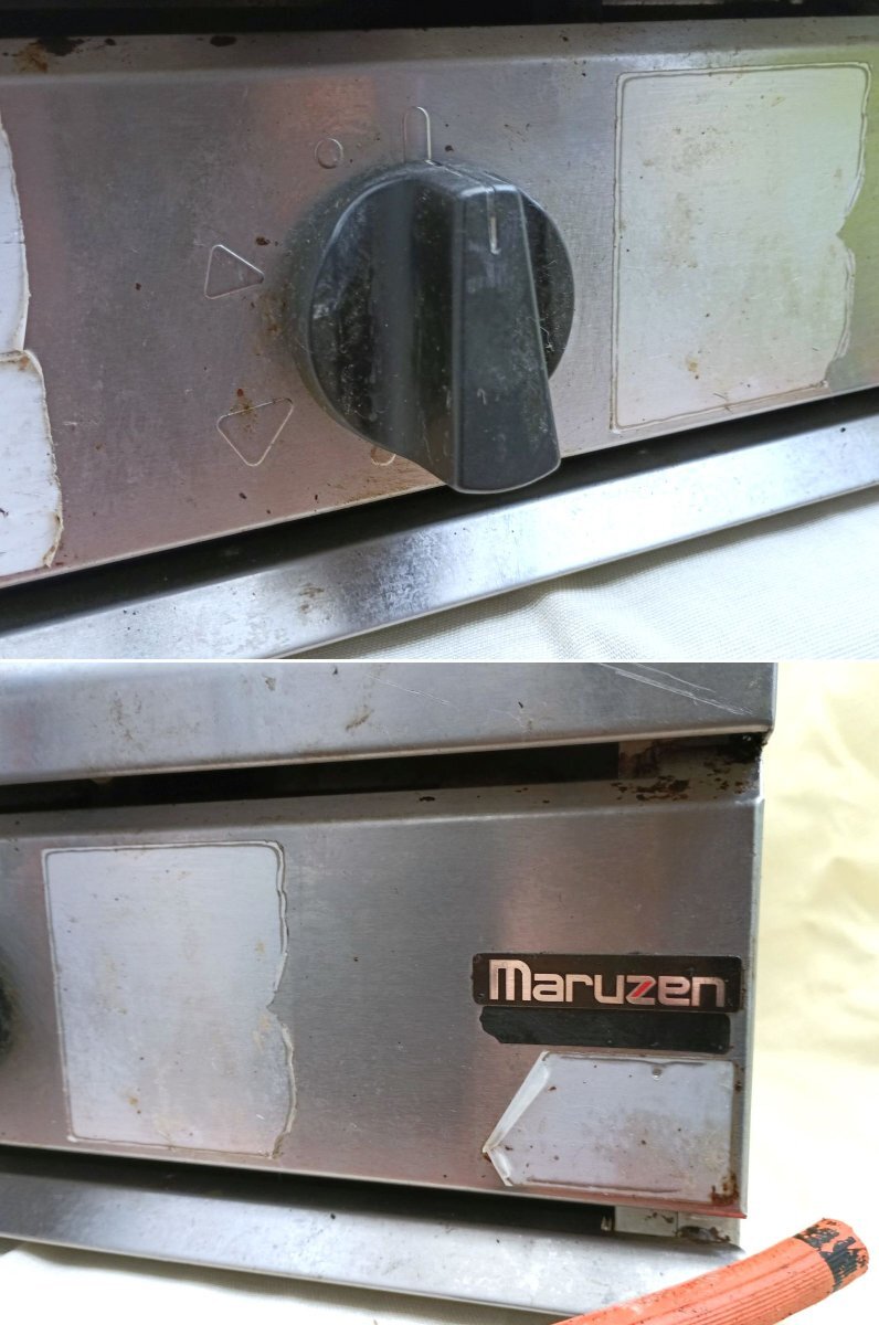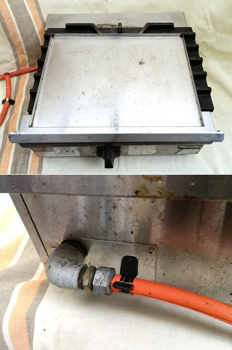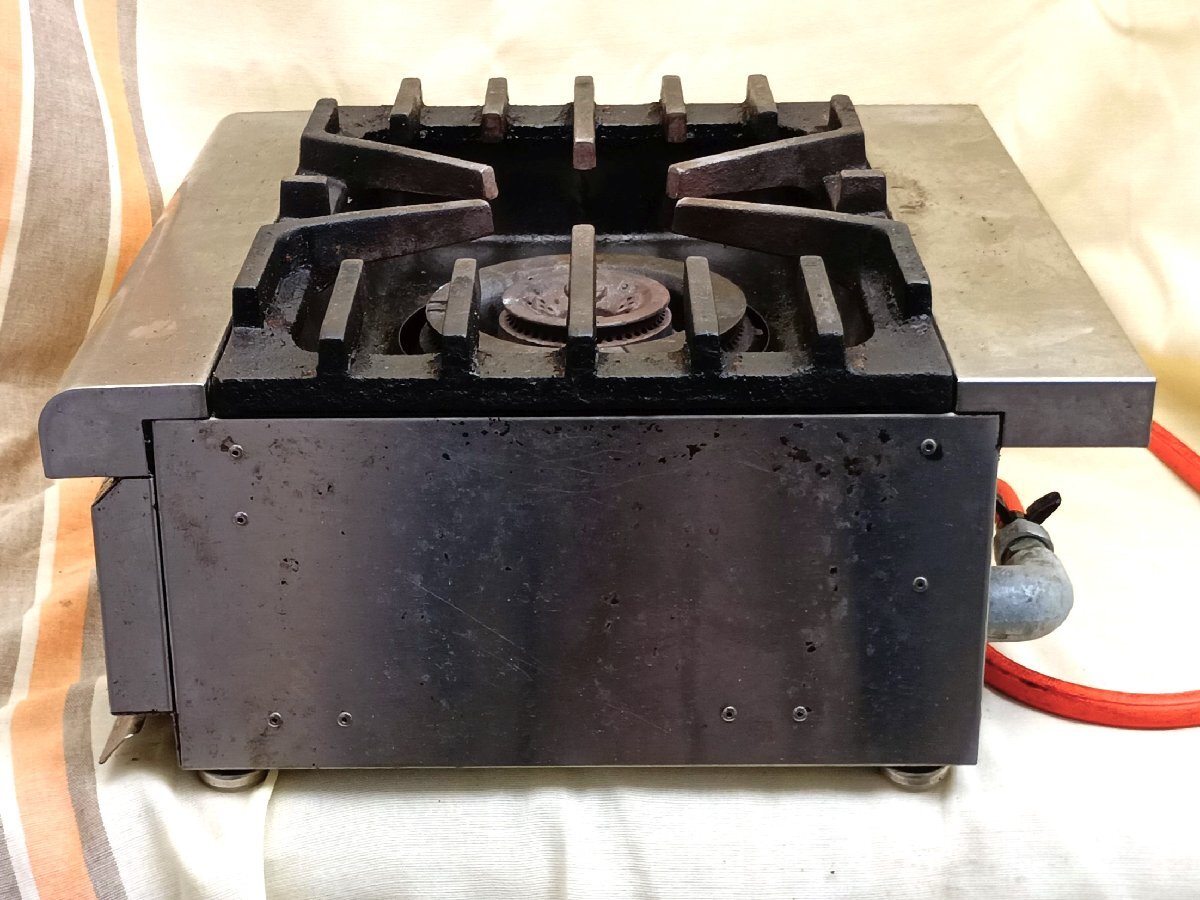 店舗にて実際に使用されていたもので、回収時点では問題なく使用されていたとのことです。 当方ではガス接続ができないため、動作確認は行っておりません。 外観は可能な範囲で洗浄済みですが、使用に伴う焦げ付きや落としきれなかった油汚れ、キズなどが残っています。 ガスホースが接続されたままの状態ですが、消耗品のため必要に応じて交換をおすすめします。