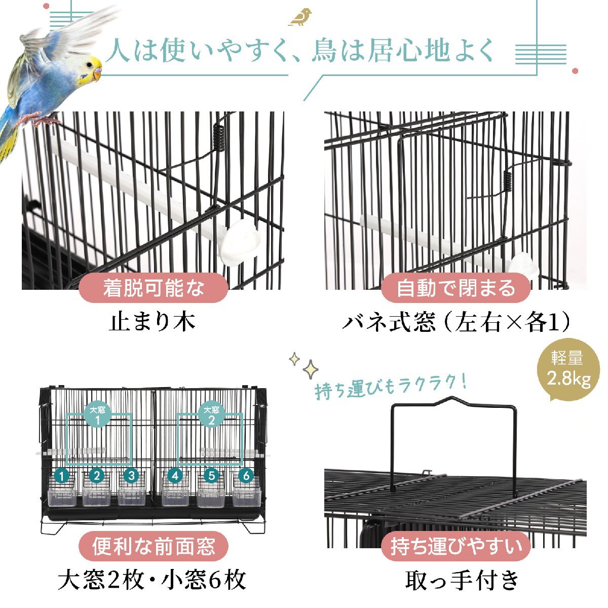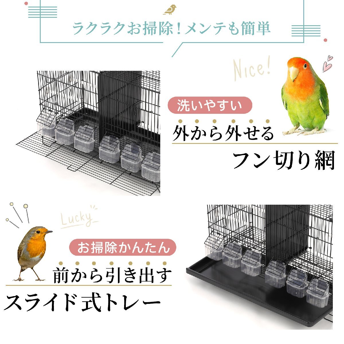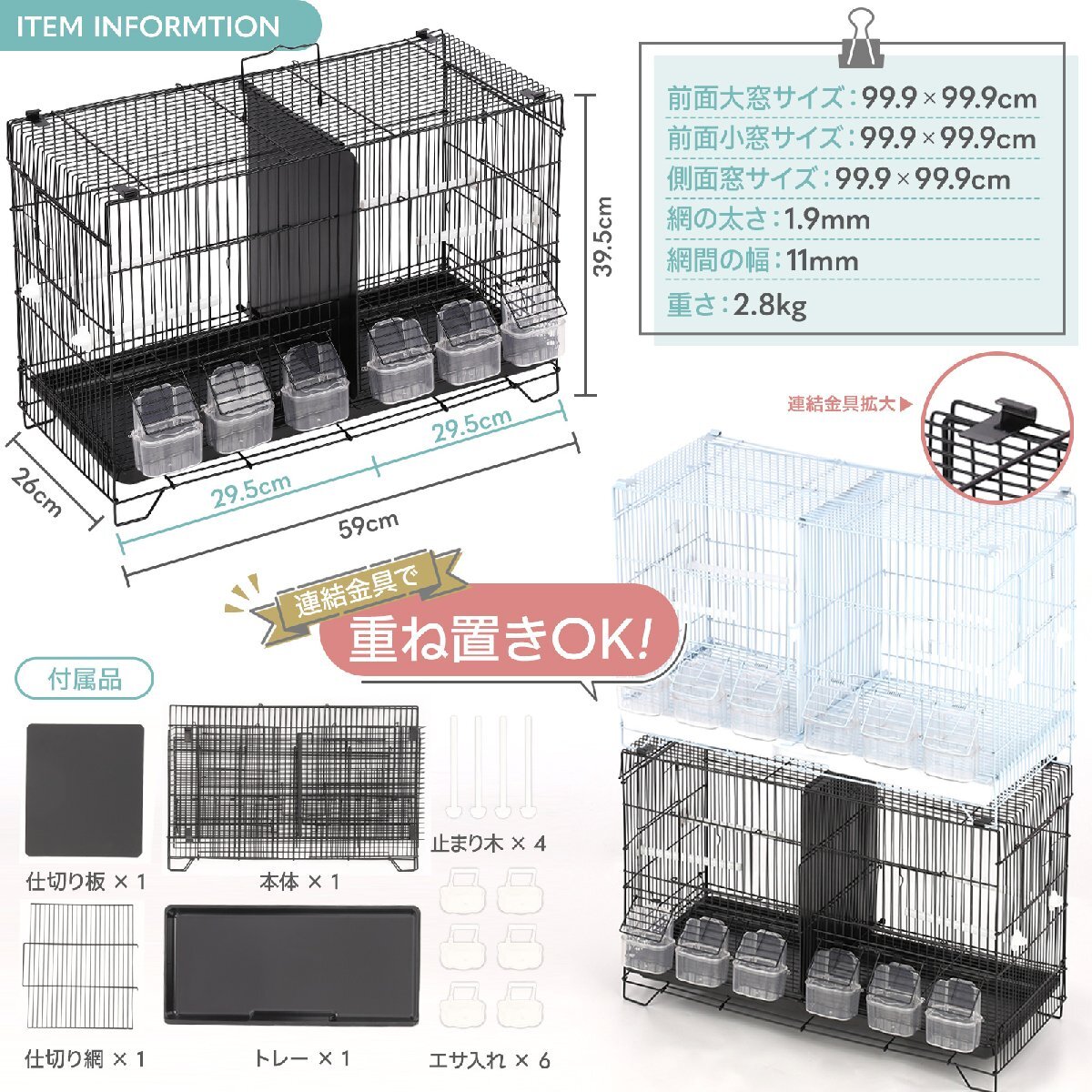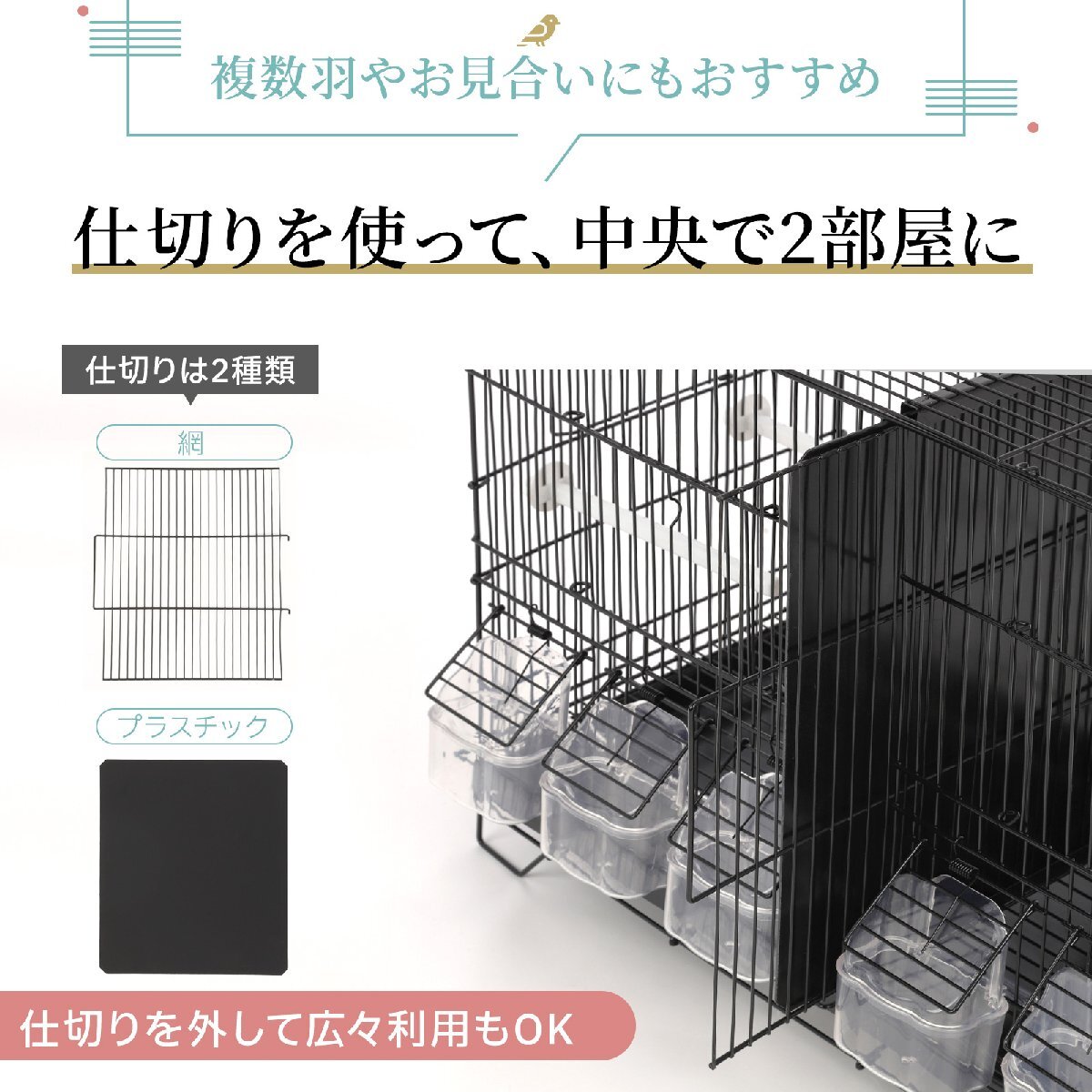 | 2部屋 ツイン鳥かご スクエアタイプ 鳥小屋 鳥カゴ 鳥 ゲージ ケージ バードケージ セキセイインコ ※付属物は商品仕様に記載されているもののみとなります。 1つの鳥かごが仕切りで左右に区分けされたタイプの鳥かごとなっております。 仕切りは取り外し可能なため、1つの鳥かごとしてもご使用いただけます。 底網付きで、底は引き出し式のため掃除がカンタン。 2部屋あるためカナリヤやセキセイインコなどの小鳥の多数飼育でも広々。 鳥かごを上に重ねることで省スペースで複数の飼育も可能です。 サイズ(約): 幅59.5×奥行き26×高さ39.5cm ●付属品 鳥かご本体(スチール製)、底はプラスチック(底網つき) 止まり木:4本 プラスチック製のエサ(水)入れ:6個 ●重さ:2.8KG ●網の太さ:1.9mm ●網の幅:11mm ※輸入品 海外品により取り扱い説明書は付属はしておりません。 またメーカー品ではない為、取り扱いについてのサポートはできません。 |