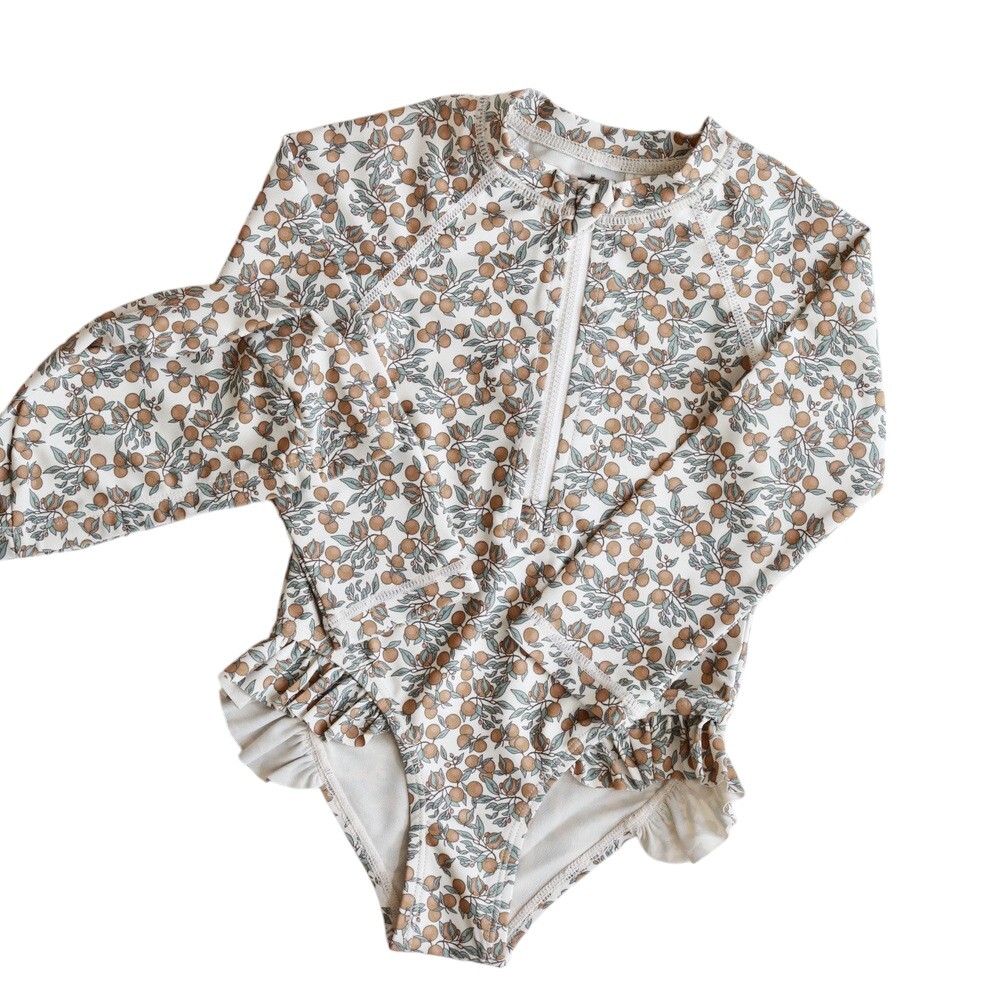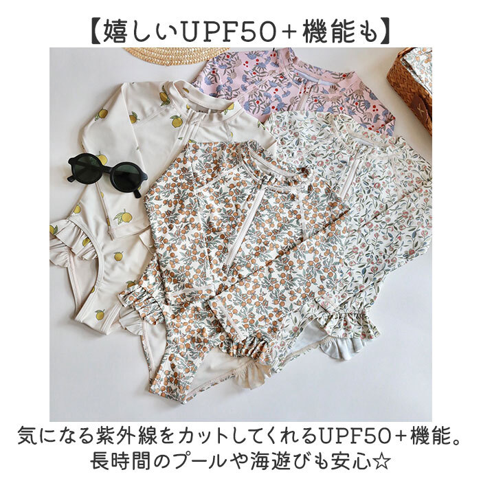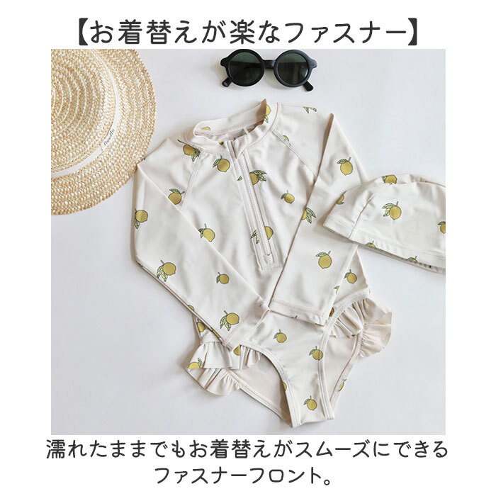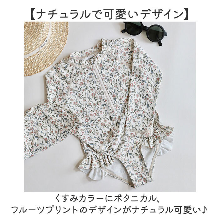 | 商品説明 | ・・【キュートな水着で楽しめる】 ・フリルが付いた可愛いデザインのキッズ・ベビー水着が新発売♪ ・【ナチュラルで可愛いデザイン】 ・くすみカラーにボタニカル、フルーツプリントのデザインがナチュラル可愛い♪ ・【露出を控えたワンピースタイプ】 ・長袖かつ、お腹が出ないワンピースタイプの水着。日よけやけが防止にも! ・【お着替えが楽なファスナー】 ・濡れたままでもお着替えがスムーズにできるファスナーフロント。 ・【嬉しいUPF50+機能も】 ・気になる紫外線をカットしてくれるUPF50+機能。長時間のプールや海遊びも安心☆ ・【帽子付き】 ・水着と同色同柄の帽子付き。水着コーデがバッチリ決まる! ・【幅広いサイズ展開】 ・姉妹やお友達とお揃いができるサイズ展開♪可愛い水着で水遊びをもっと楽しめる |