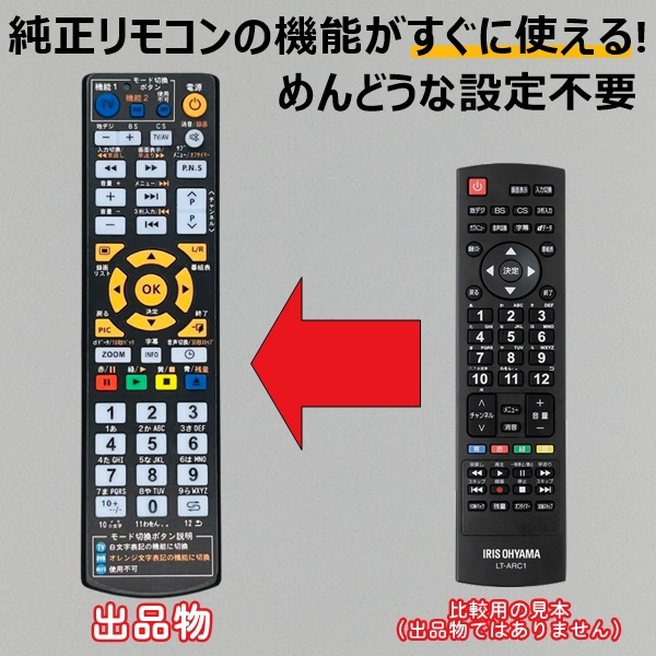 | 【商品名】 アイリスオーヤマ LT-ARC1 代替リモコン 【対応機種】 LT-32A320 LT-40A420 LT-43A420 LT-43A620 LT-49A620 LT-55A620 LT-65A620 32WA10P 40FA10P 43FA10P用 比較画像の右側の純正リモコンが付属する機種に使用出来ます。 上記機種以外については、質問欄よりメーカーと型番をご連絡頂ければ、対応品のご案内をしております。 【商品について】 左側の代替リモコンが出品物になります。右側のリモコンは見本画像です。 タイトル機種のリモコン信号を入力した、設定不要で使える純正品と同等の代替リモコンです。 乾電池は付属しません。別途ご用意下さい。(単4乾電池×2本) 【商品サイズ】 縦18.5cm×横5cm×高さ2.35cm 【発送について】送料無料 迅速発送を心掛けております。土日祝日はお時間を頂く場合ございます。 ポスト投函配達となり、日時指定は出来ません。 | ||