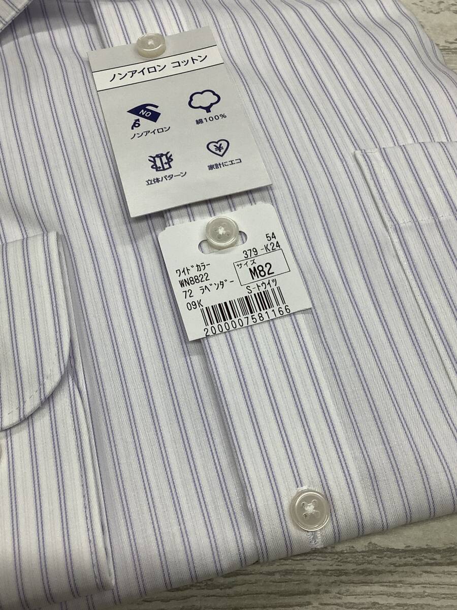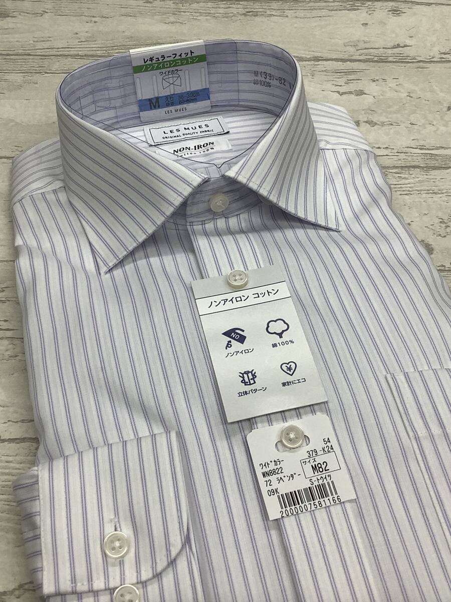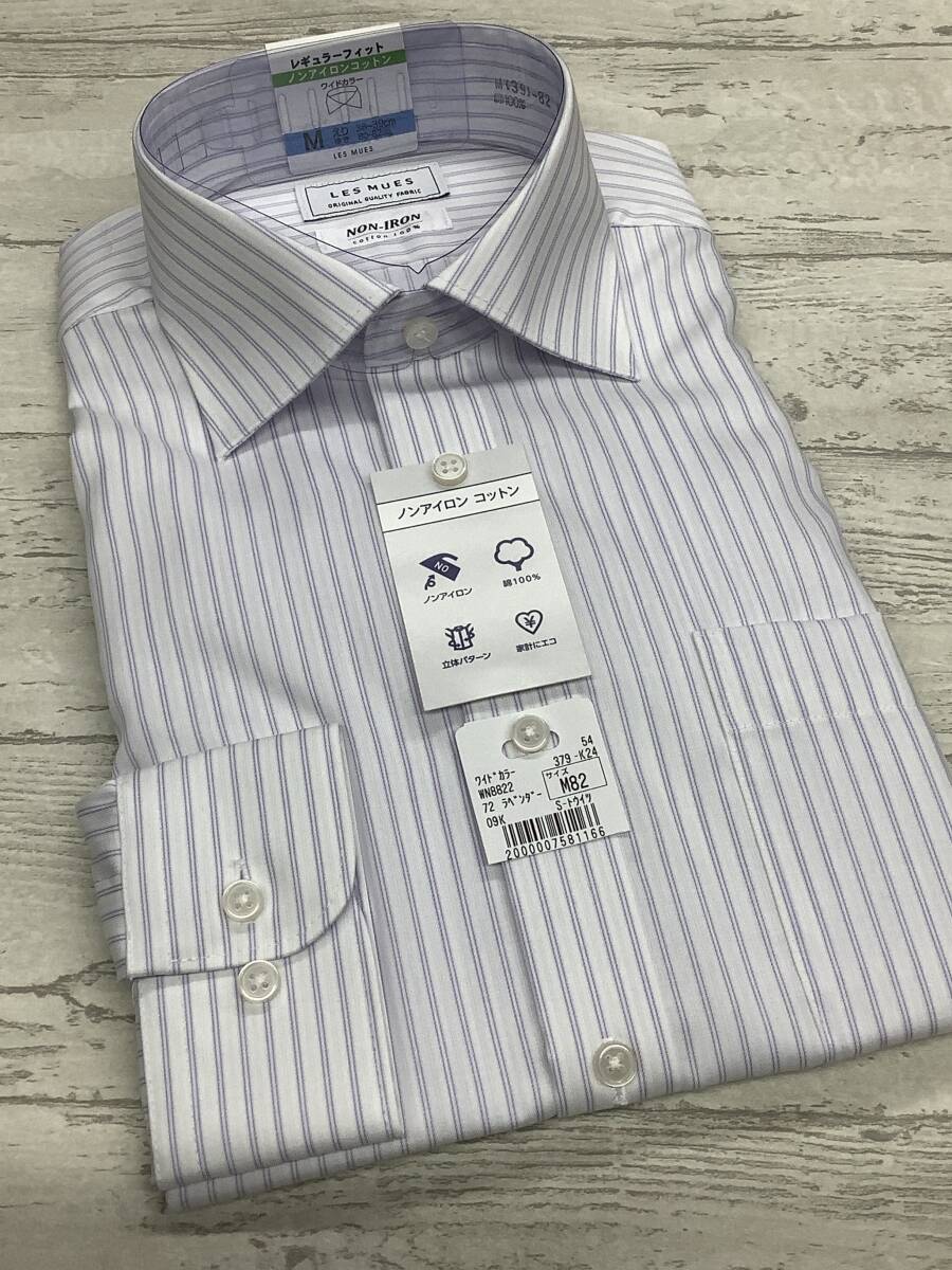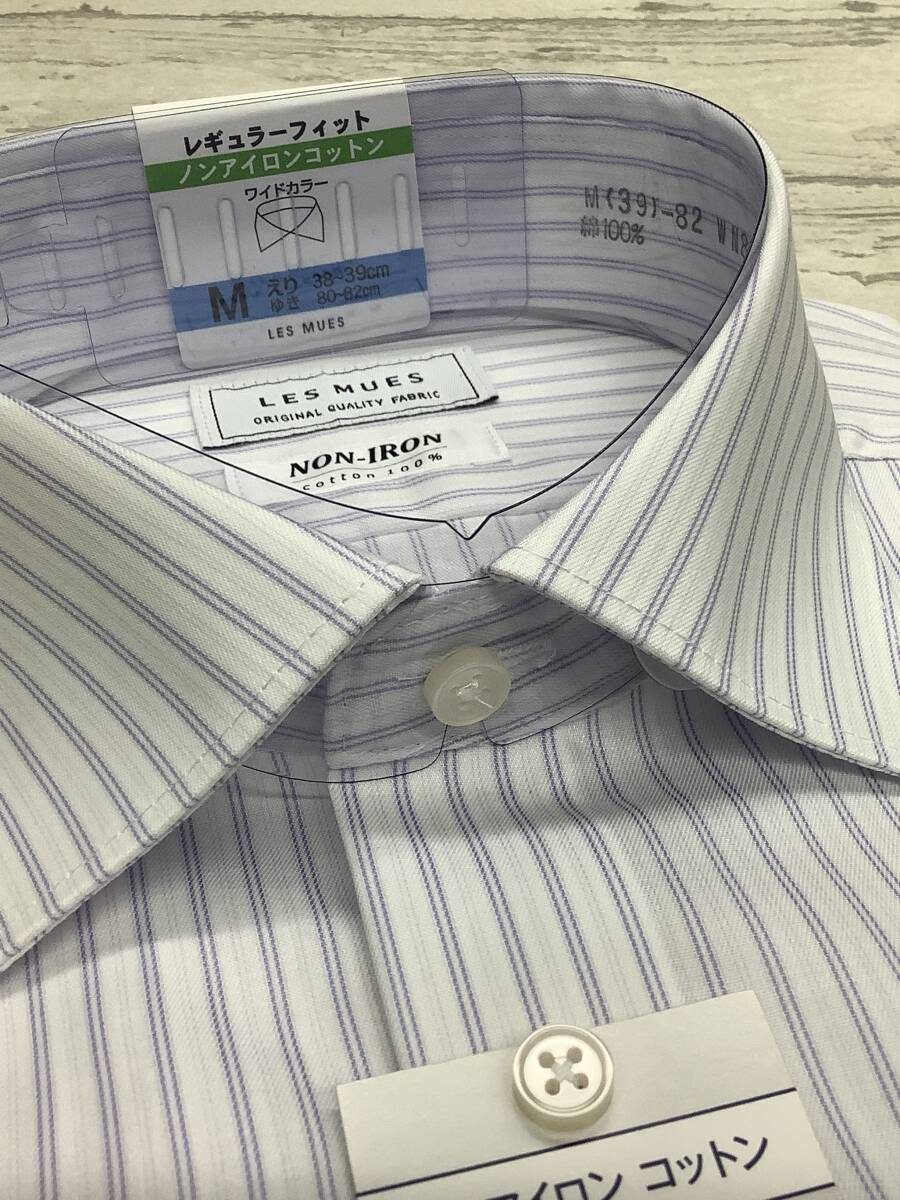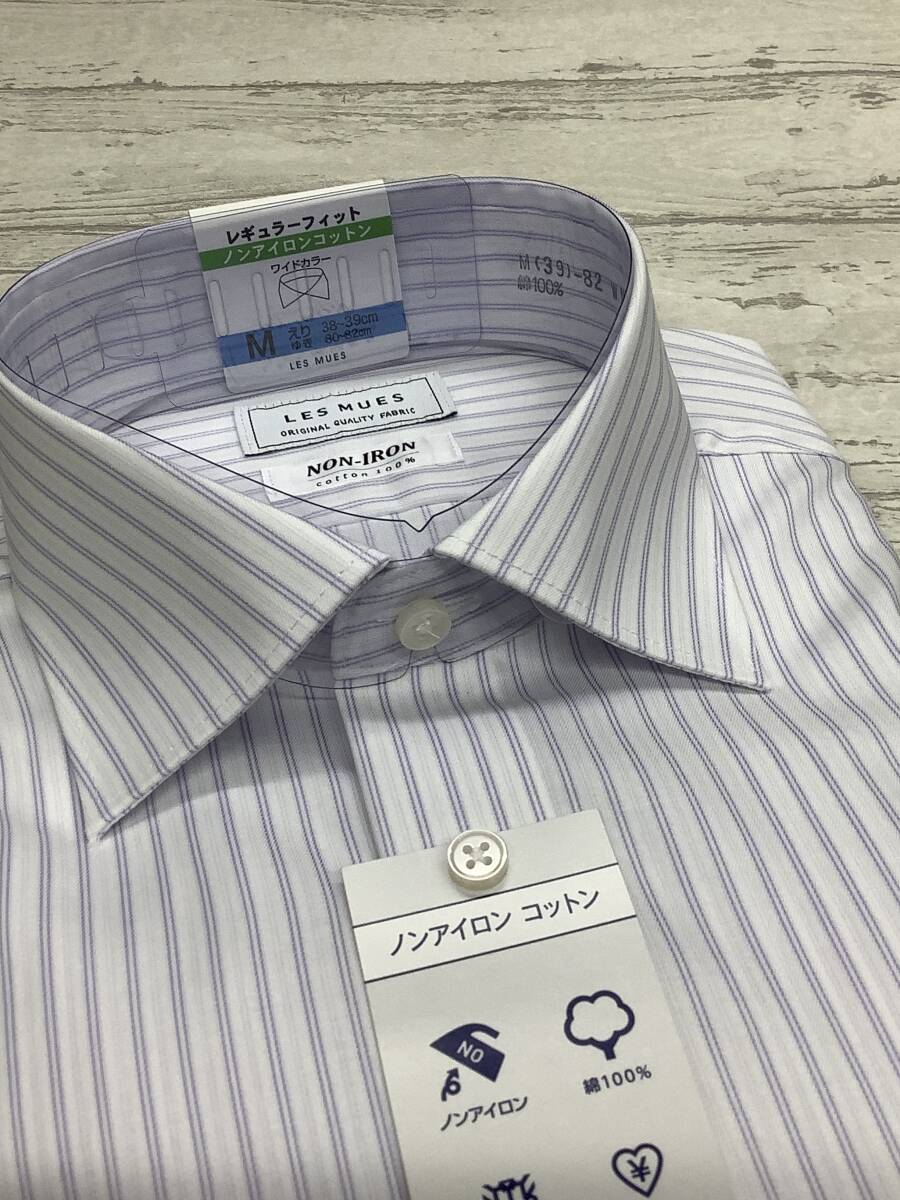 39-82 新品未使用 Mサイズ 綿100%のカッターシャツ ストライプ ノンアイロン ワイシャツ ネイビースーツによく合うラベンダー