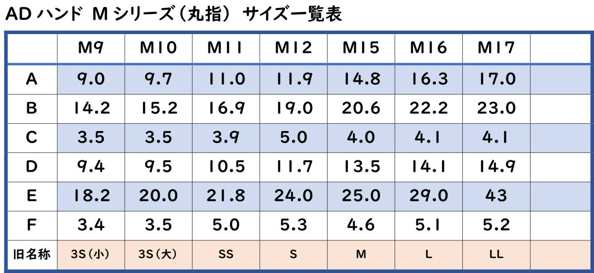 (例:ADバーニア Sサイズ9mm×3、ADハンド Mシリーズ M11×2など)